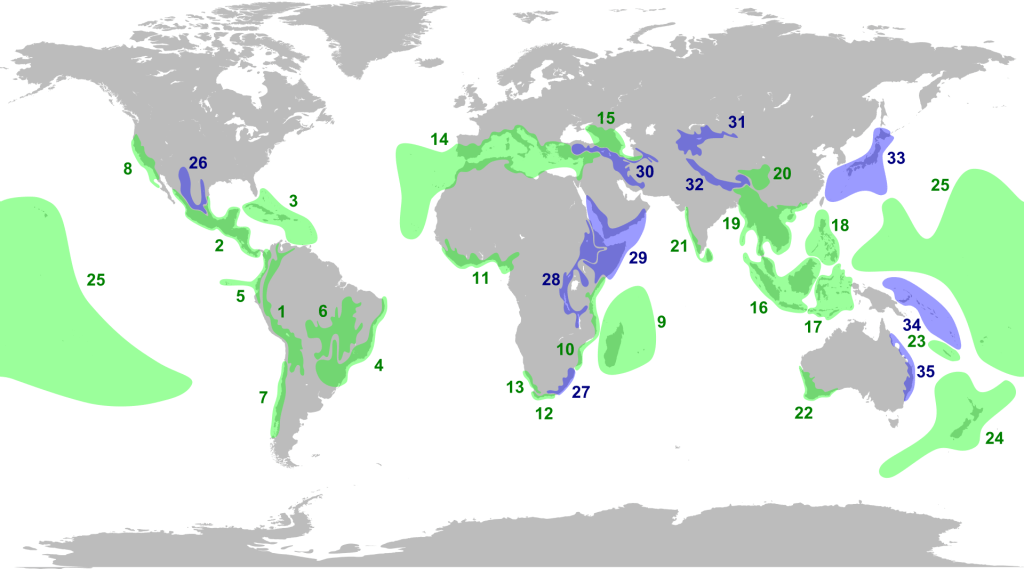 A widely-used concept in conservation biology is that of “hotspots“. This term can be defined precisely, like that by the Critical Ecosystem Partnership Fund (CREF) that defines a hotspot as having more than 1500 endemic vascular plant species and 70% of the original land cover already has been lost. Endemic species are those found in a limited region and nowhere else. As with biodiversity, the concept of endemism is relative. All biota are endemic to the planet Earth. A great many species are endemic to North America. A much smaller number are endemic to the state of Florida, and probably very few (possibly no) species are endemic to the smallest county in Florida.