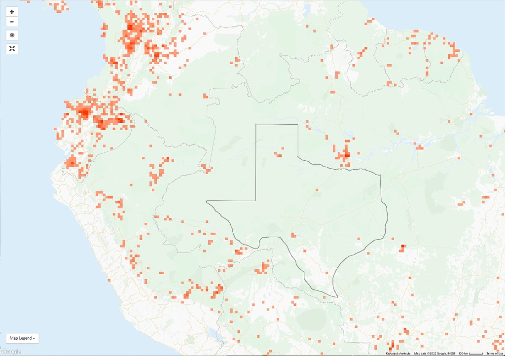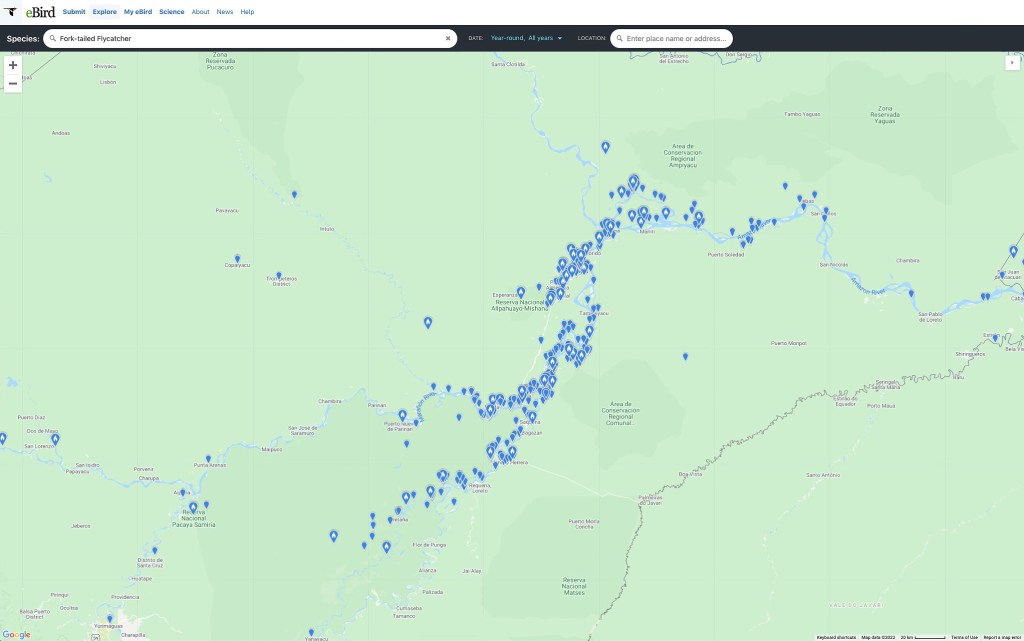 Although perhaps not obvious from the map above, rivers, being the main transportation route in many parts of the Amazon Basin, show a marked concentration of citizen scientist observations. A closer view below shows the Iquitos, Peru area and all eBird observations of a Fork-tailed Flycatcher (Tyrannus savana). It may be that this Flycatcher has a strong preference for riverine habitat – or that the observations reflect a strong sampling bias. We don’t know.