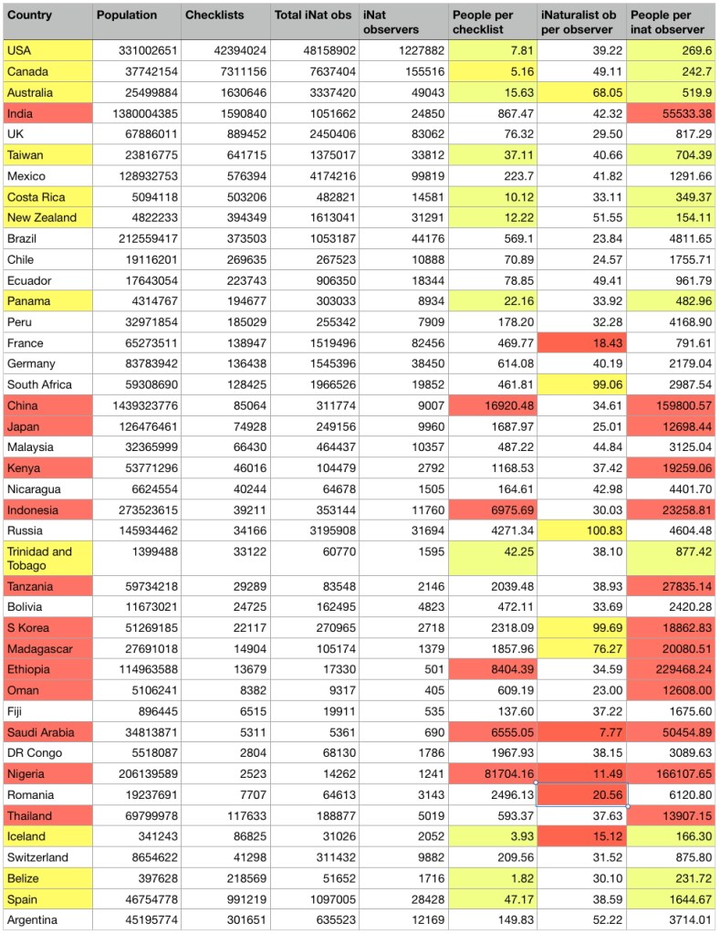 Let’s consider some practical possibilities to improve the spatial mapping of biota. Where are iNaturalist or eBird observations needed? While every country has data voids, some are more important than others. A multi-pronged strategy to fill such voids might start with educational outreach to locals within the area/country. To start, this might require a website that shows the current observations, outlines key areas that are missing observations, and then suggests a strategy to increase observations there. Identify groups of people willing to jointly survey the area (safety in numbers and some specialists to help). Suggest positive reinforcements for helpers – inexpensive, but visible, rewards for helping. Identify areas where a short, intensive campaign by locals could make an initial survey. Ideally with a one-day effort. This is impractical for remote locations and most islands but might be feasible for mountainous areas near population centers.