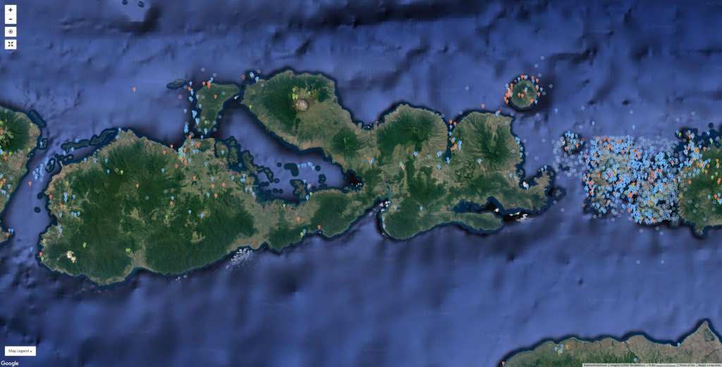 Some obvious biogeographical questions arise from the imagery shown above. Do these mountains have similar biota? Or has speciation occurred among the biota that are unable to migrate easily across the intervening lowlands. Are these mountains effectively “sky islands” on a larger island? How much biodiversity is being missed by the undersampling of the mountainous and forested areas of the island? These are general non-technical biogeography questions; specific questions might relate to individual groups of organisms or individual species. All would require many more observations than currently exist. (This discussion assumes no non-iNaturalist observations exist – this is certainly not true and many specimens from the island must exist in museums around the world. Whether they sample well the various isolated mountains on Sumbawa is another matter.)