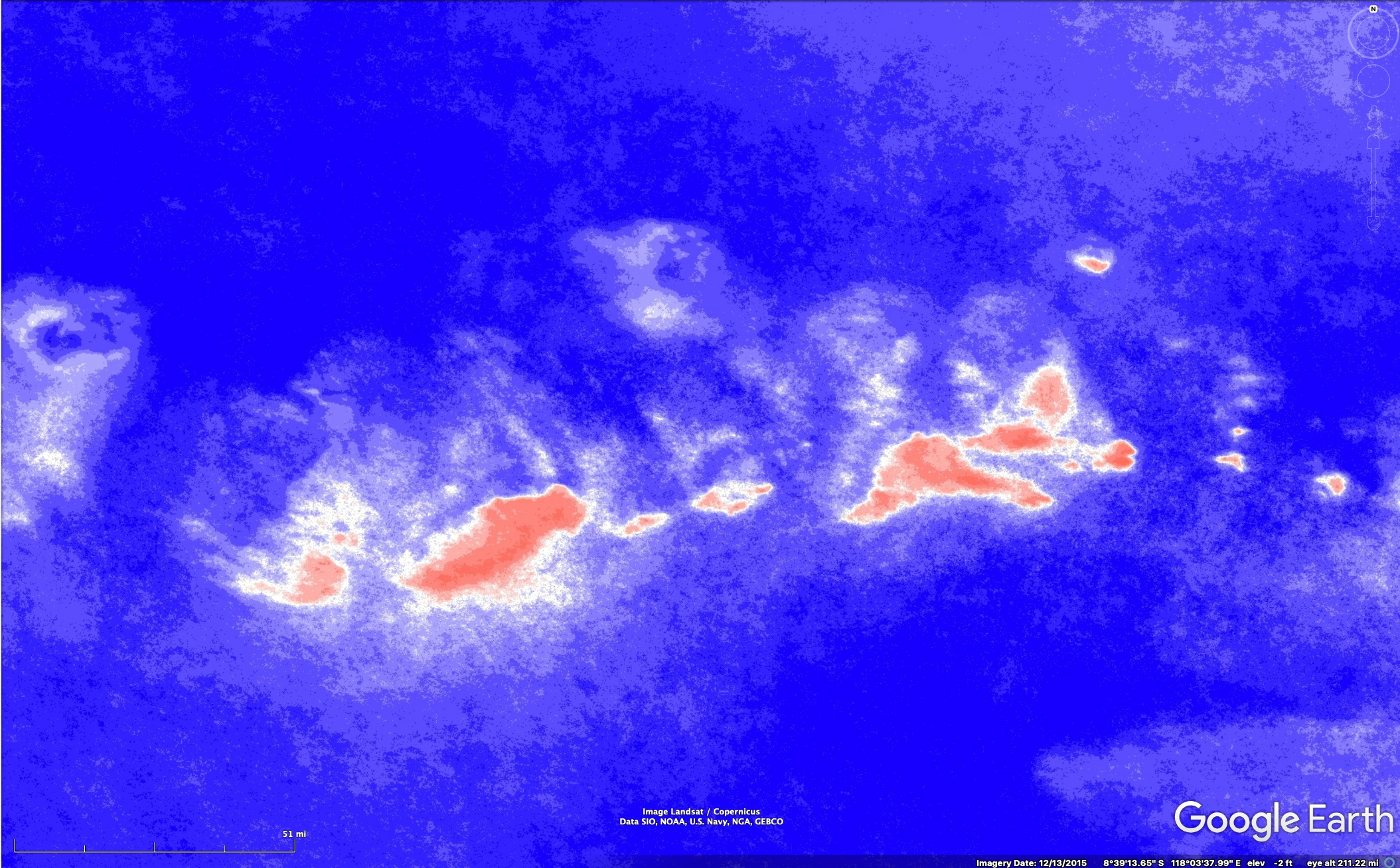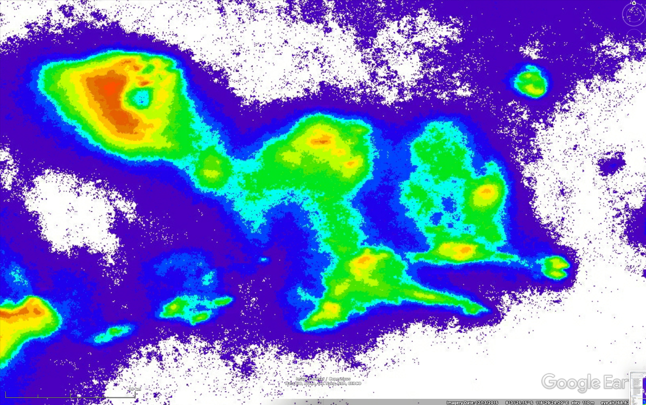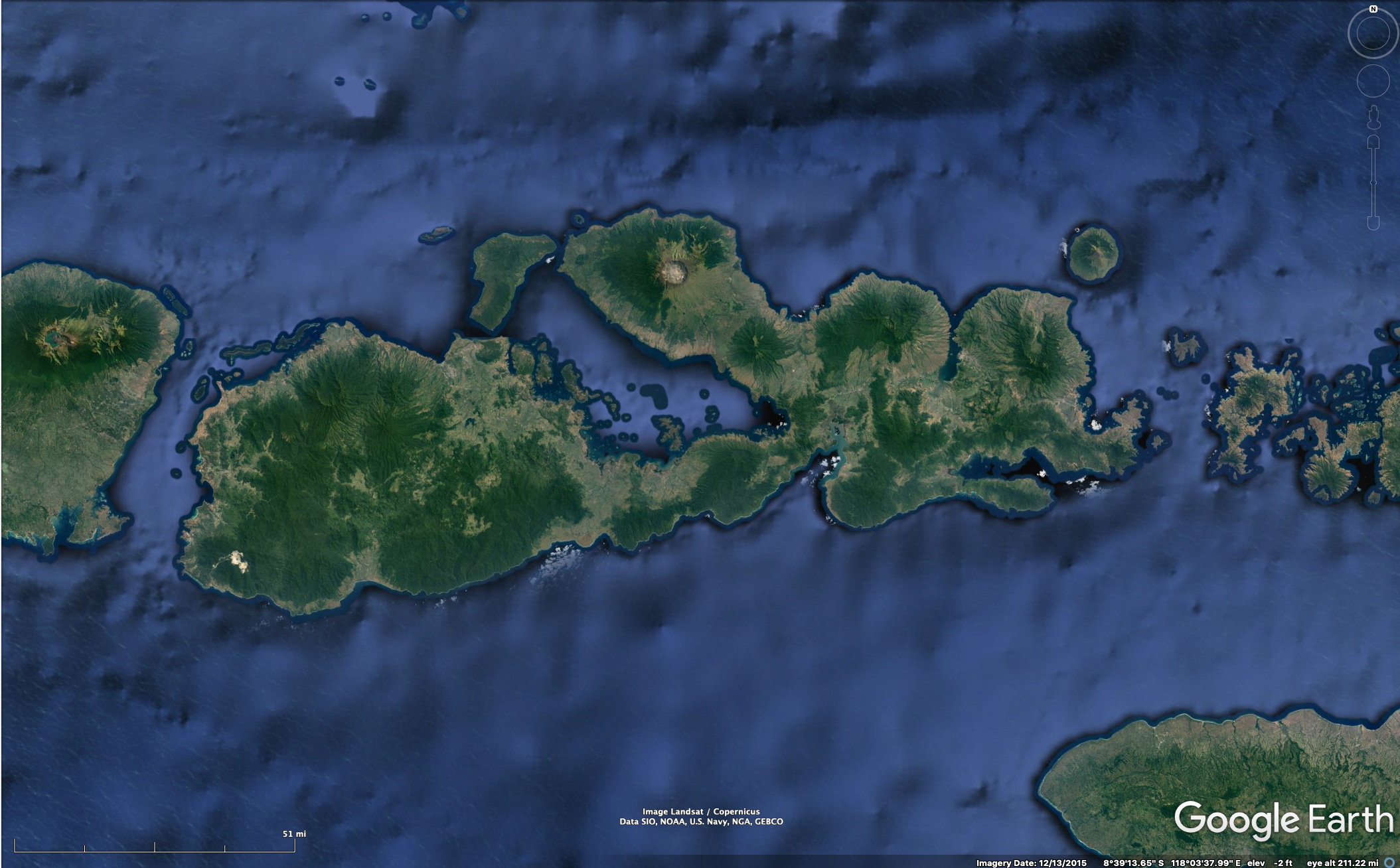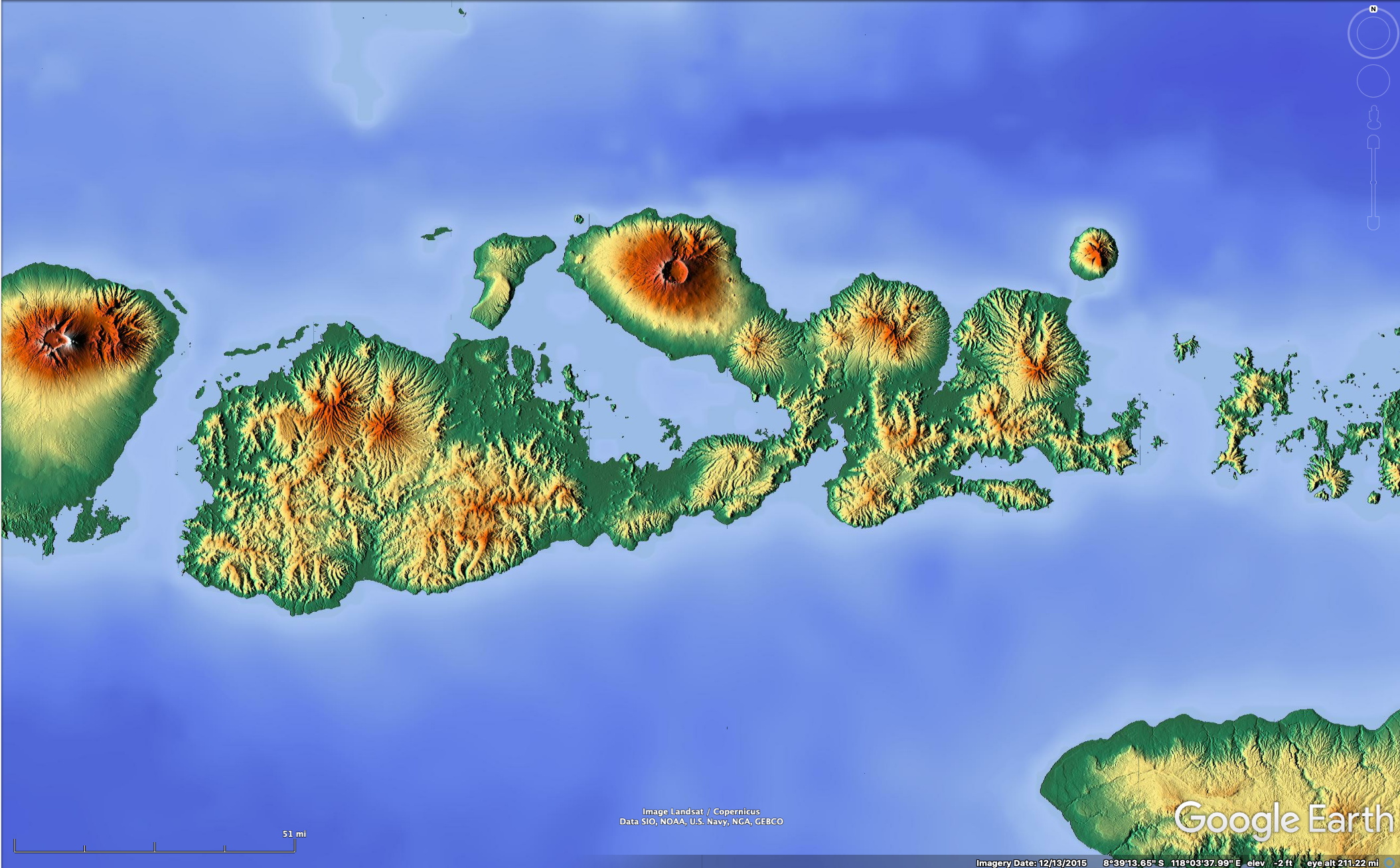Here we consider an example of how one might proceed to improve iNaturalist observations in a biodiverse region where such observations are seriously lacking. We consider the island of Sumbawa, Indonesia. This island is large – about 265 km (165 mi) in east-west extent and with more than 10 volcanic mountains in various stages of erosion. These mountains are separated by low-altitude areas of seasonal dry forests, now mostly replaced by agriculture. In contrast, the volcanic peaks have evergreen forest supported by frequent cloudiness even during the dry season. See the figures below for the geographical and climatic situation. Because Google Photos and WordPress don’t have “no-transition” options, I have chosen to display the relief and vegetation relationships via the image-comparisons below.