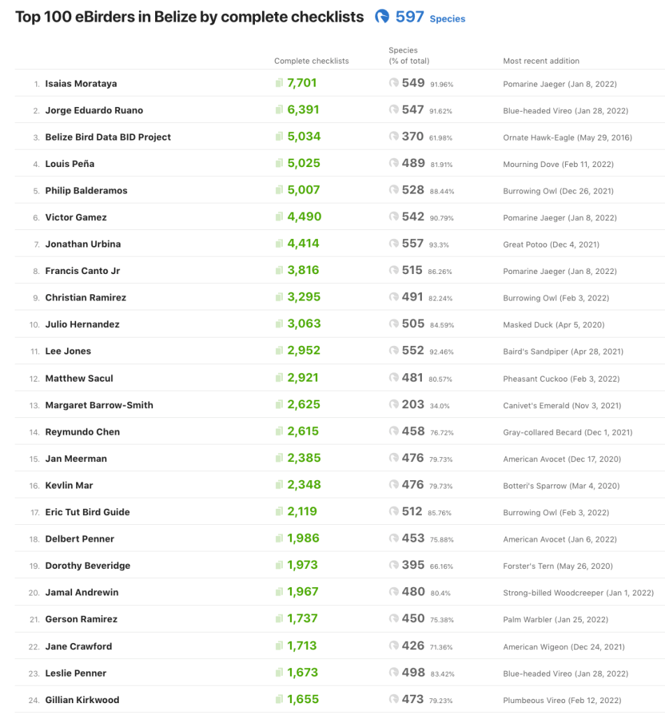 As with iNaturalist observations, observers reporting on eBird also can also be stratified by observations (checklists) for any country. These require more scrutiny, since many are tourists or birding tour guides to popular birdwatching countries. High-count eBirders are often also frequent iNaturalist contributors as well.