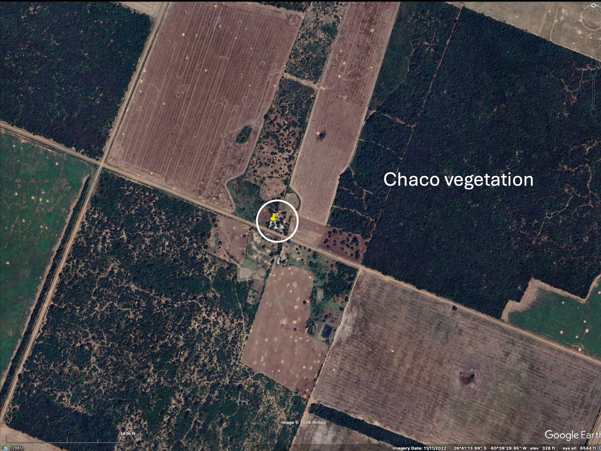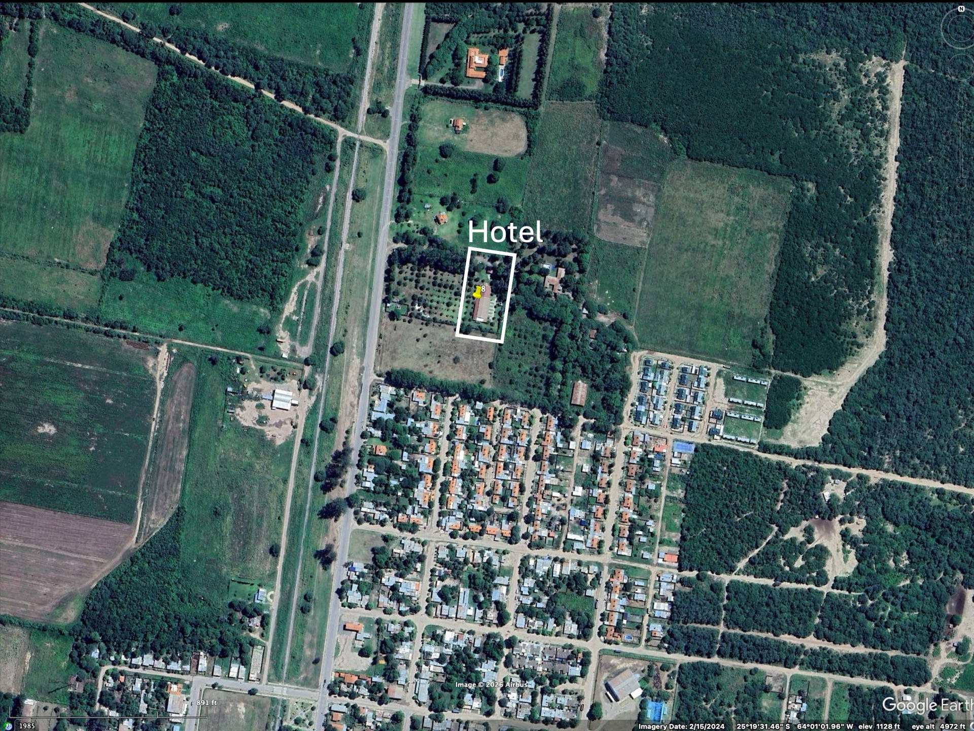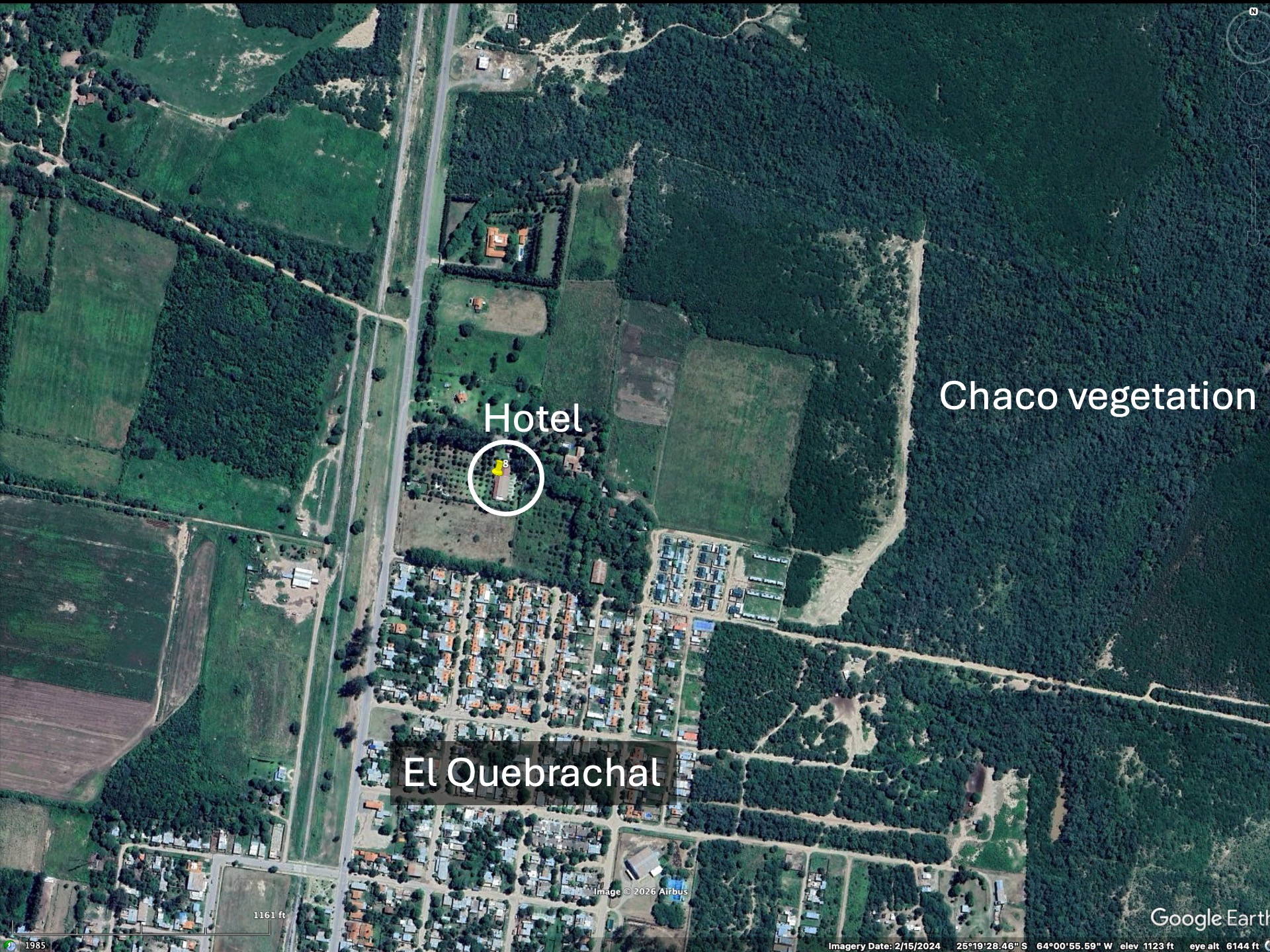 We found on Booking.com a hotel that looked ideal – off the main Trans-Chaco highway about 10 km, and close to large patches of natural Chaco vegetation. As we pulled in, dogs approached our car – fortunately they turned out to be “friendly”. We were able to take a walk the following morning to look for birds and some plants to get a flavor of the location. The Google images below show the location of the hotel and surroundings. The hotel was very small – in terms of available rooms, but was in good condition and frequented by foreigners. Insects were plentiful during the evening.