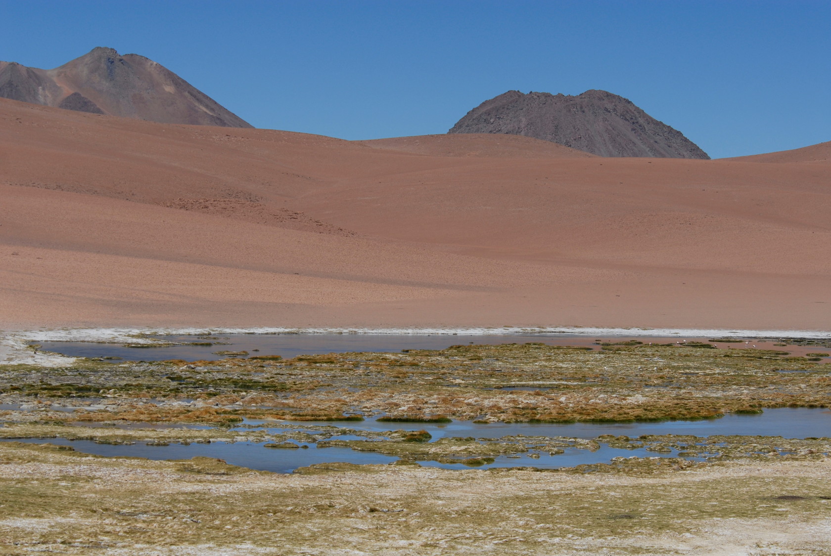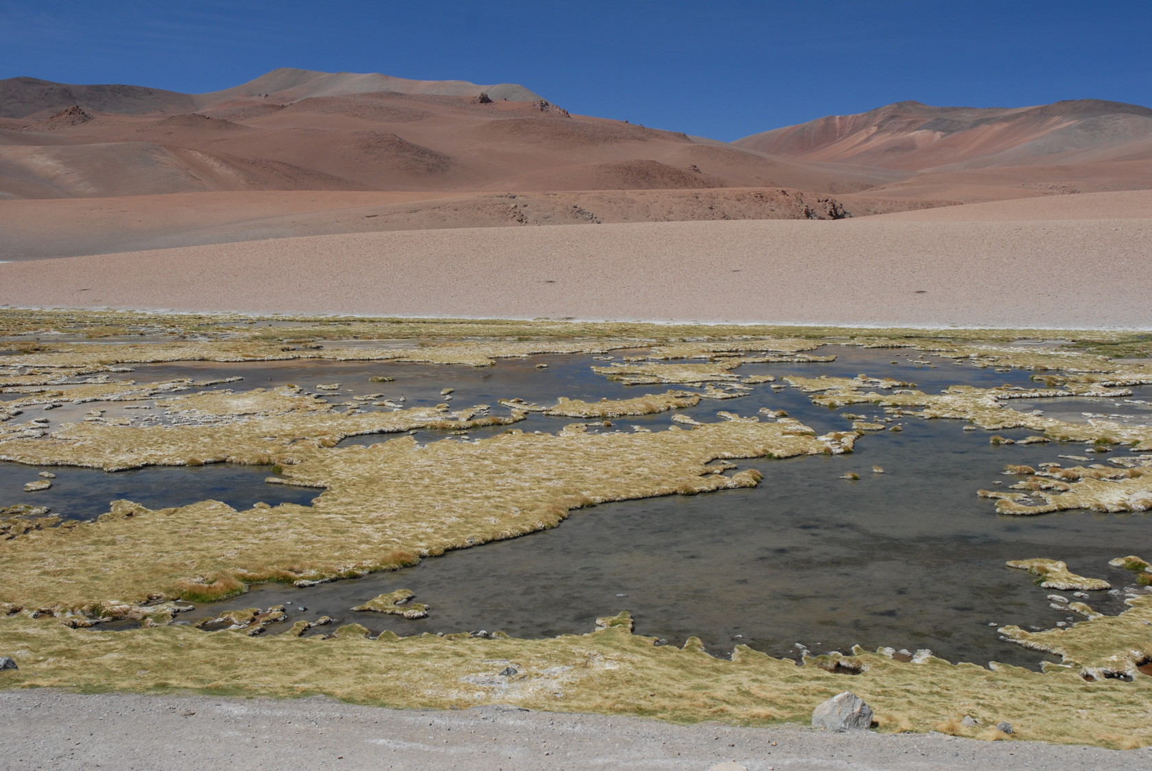 A bofedal – a high altitude marsh dependent on melting winter snow or groundwater seepage. Usually these are saline, but are areas frequented by guanacos and vicuñas, Andean coots and flamingos also occur here.