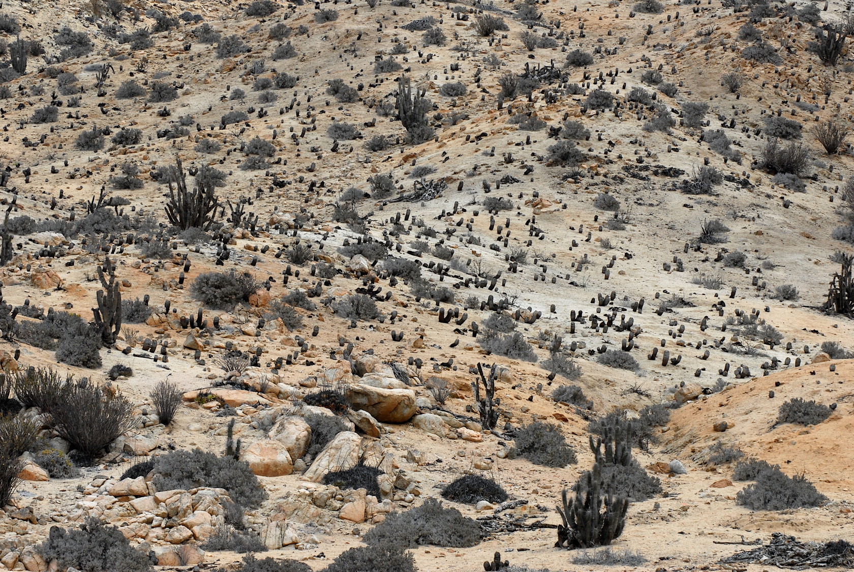 A tall Echinopsis chilensis cactus dominates the landscape near La Serena. To the south there are more shrubs, to the north less. This cactus is not found much farther north.