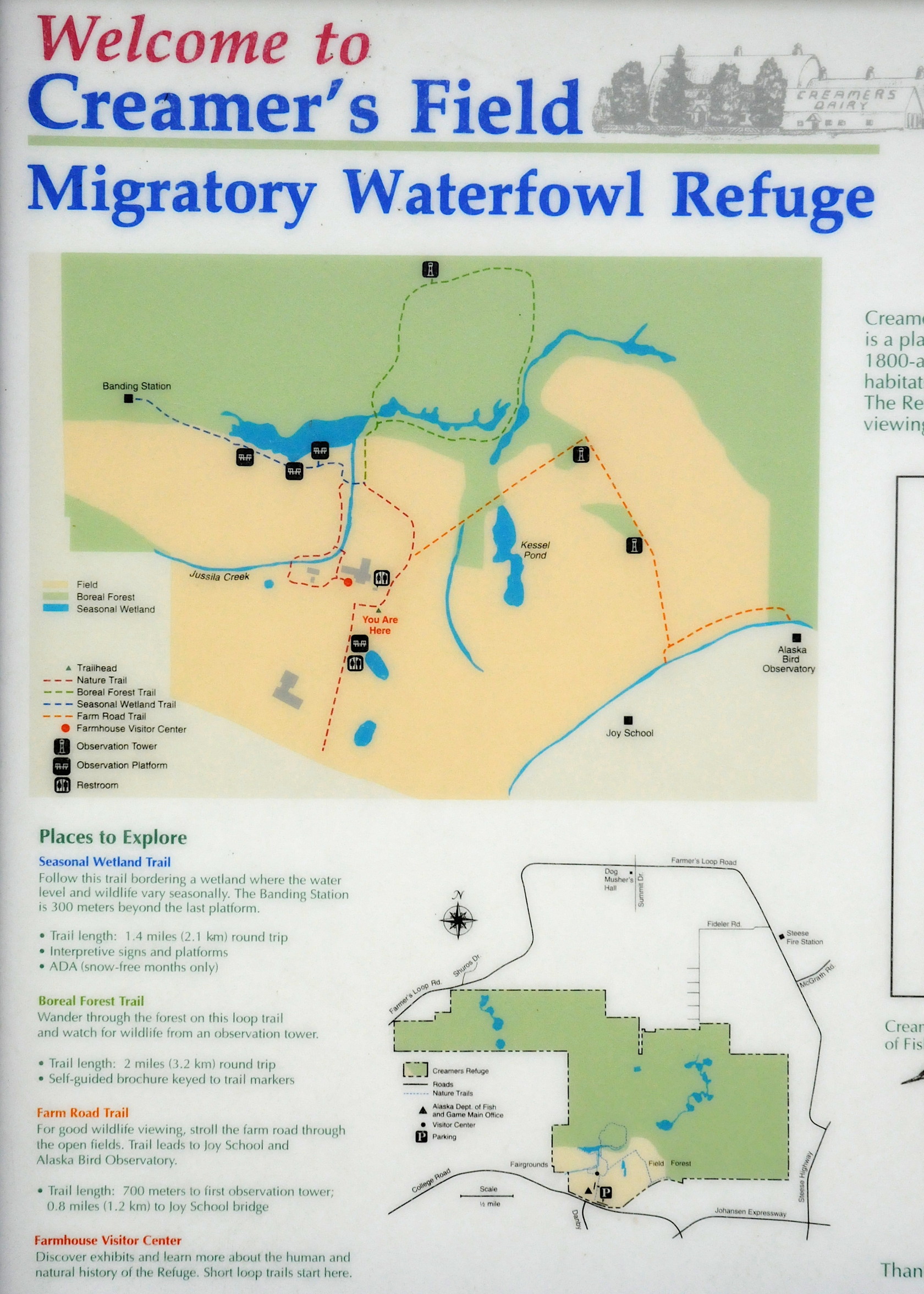 Creamers Field Migratory Waterfowl Refuge is on the north side of Fairbanks and is an old dairy farm that attracted many migratory birds. It became a state sponsored refuge in 1966 and is now managed by a non-profit organization. There are very nice nature trails here and one through a boreal forest environment has many informative plaques. It is online here.