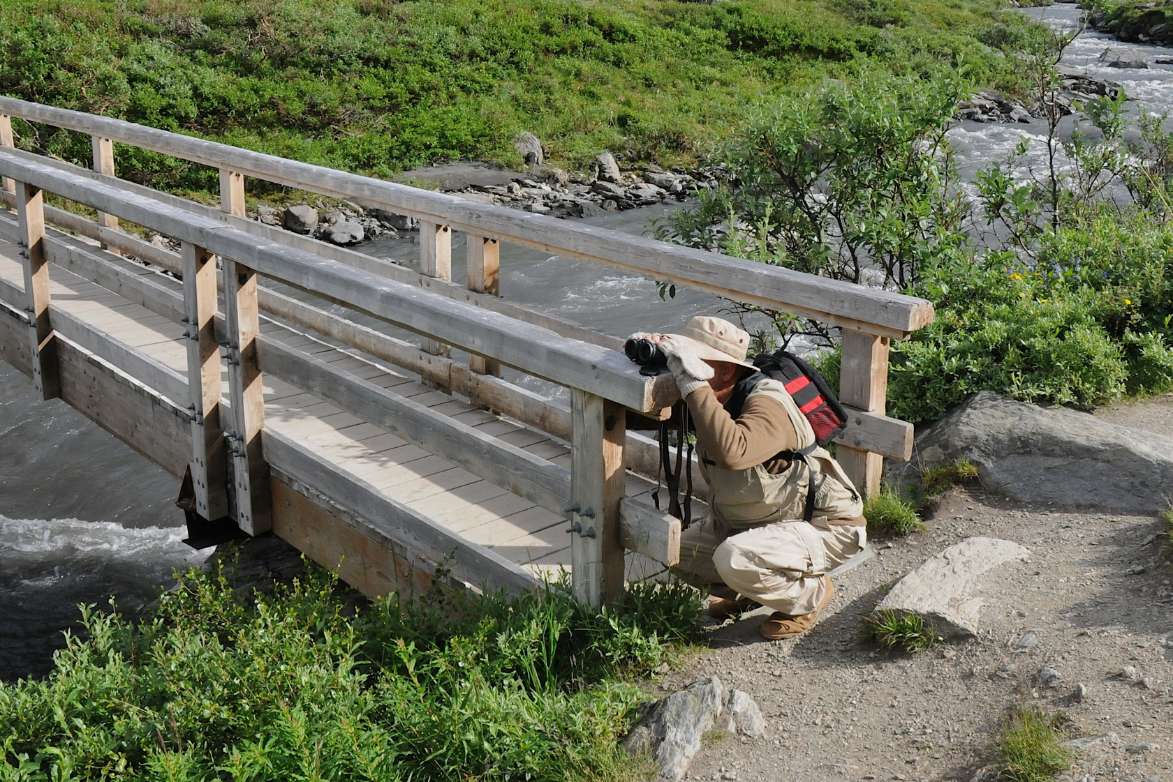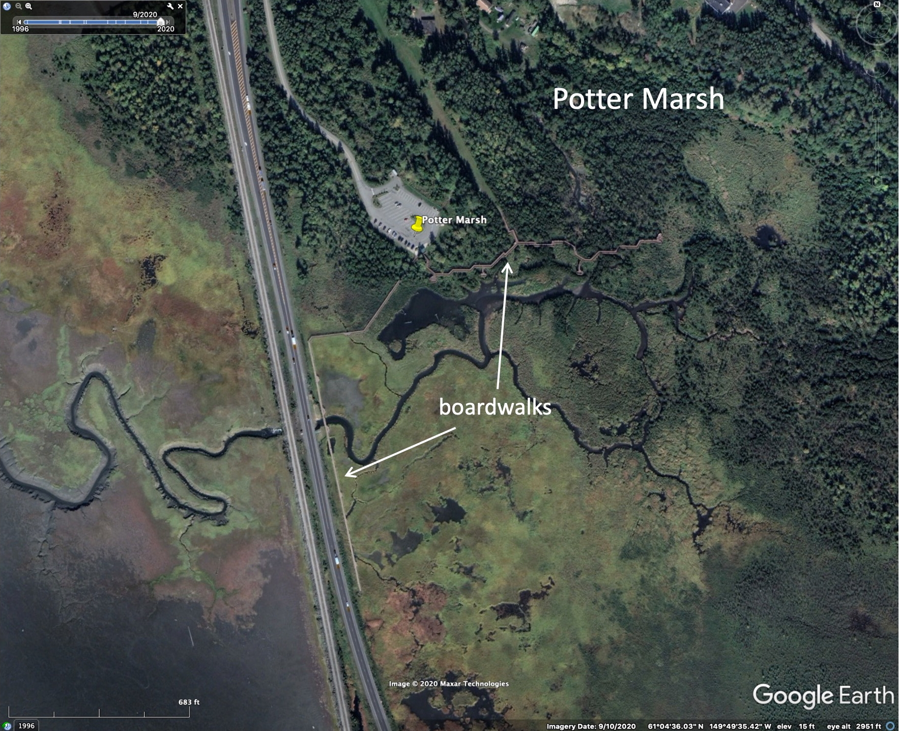 Close to Anchorage, Potter Marsh (also here) is just on the southern edge of the city and has excellent boardwalks to look for birds. The advantage of this location is that if you have a late flight you can prepare your luggage here in the parking lot. You can also use the last available time before a flight (or a train ride to your cruise ship departing from Seward) enjoying the marsh. During summer there is light until near midnight.