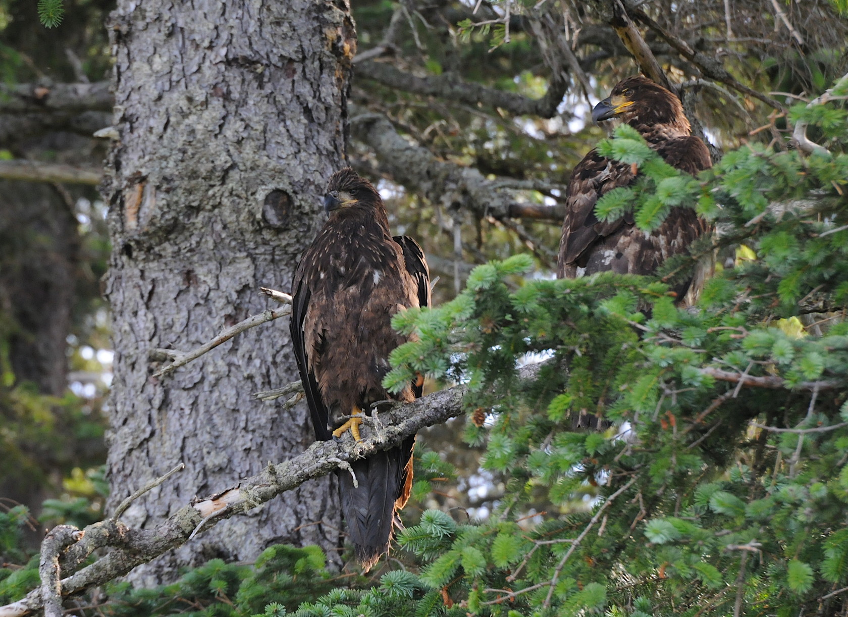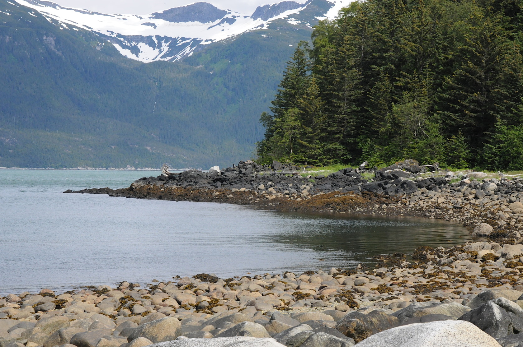 In Haines we walked to the public library to check the internet, then returned to the ship. The shoreline at the ship’s dock was a natural cobblestone beach with many interesting rock pebbles and with interesting marine algae. Then there were the birds. Our best views of Pigeon Guillemots were from the dock, while ravens walked the beach. Bald Eagles where in the trees nearby and a short walk (less than a half mile) down the “Beach road” was a lookout among the natural forest. Bald Eagles, common in Alaskan ports, were here. All in all, we had a relaxed day, without the trouble of a round-trip fast ferry and train ride that most tourists opted for. We had Haines almost to ourselves.