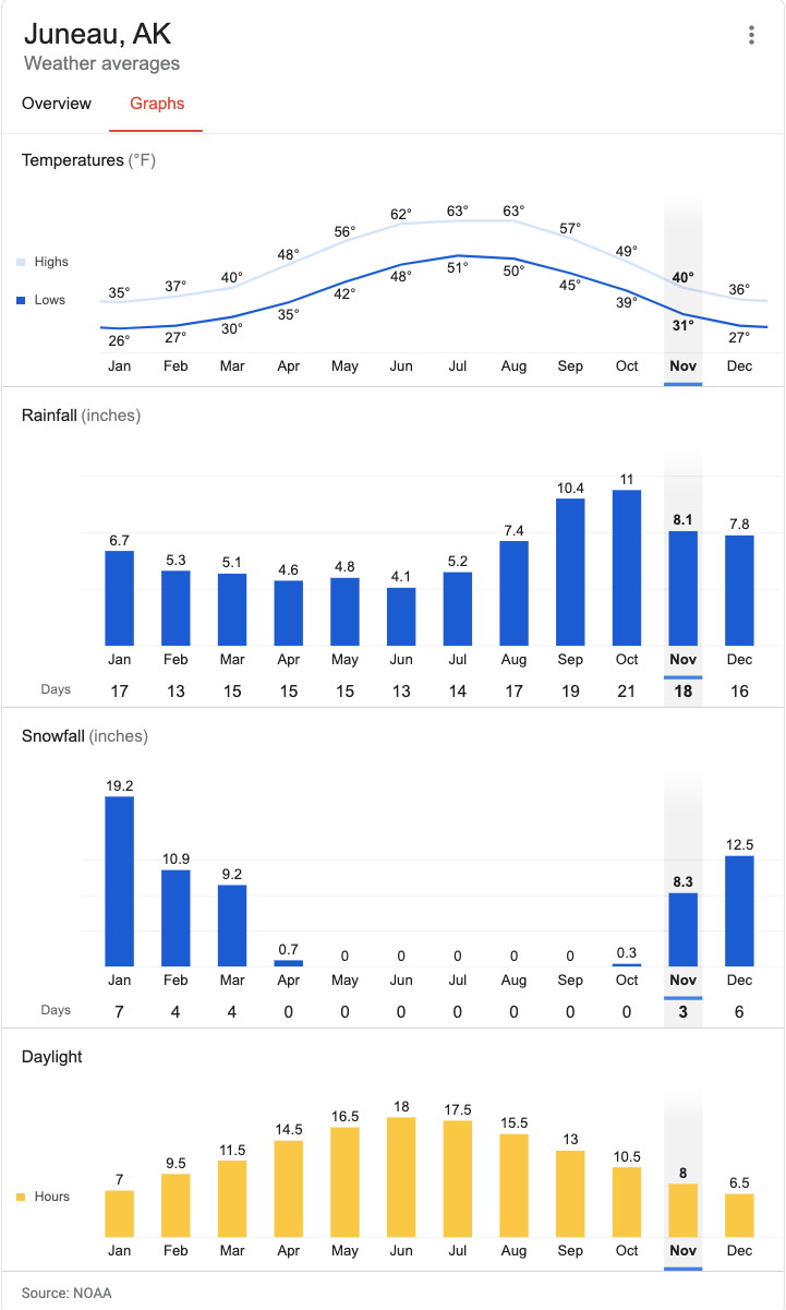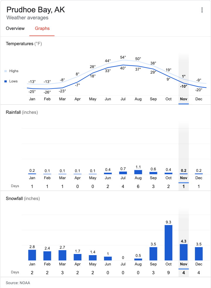 Alaska has a variety of climatic conditions. Many resources are available online and there are even popular books written about its climate. Here we greatly oversimplify the climate information and show climate diagrams for only four locations – three are major towns or cities and one, Prudhoe Bay, is on the Arctic Ocean coastal plain where only oil workers normally go. But they give an idea of the extreme conditions in far northern Alaska.