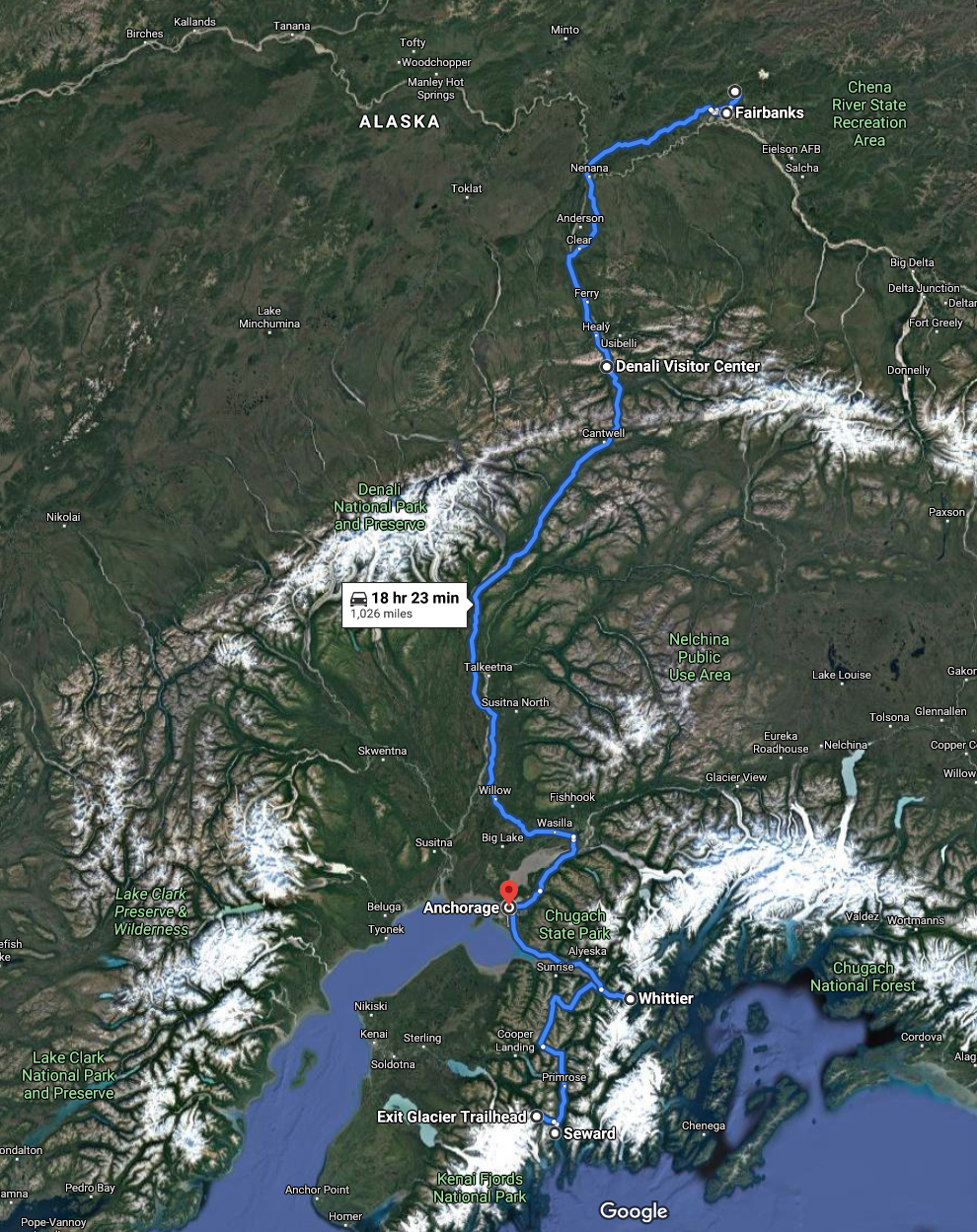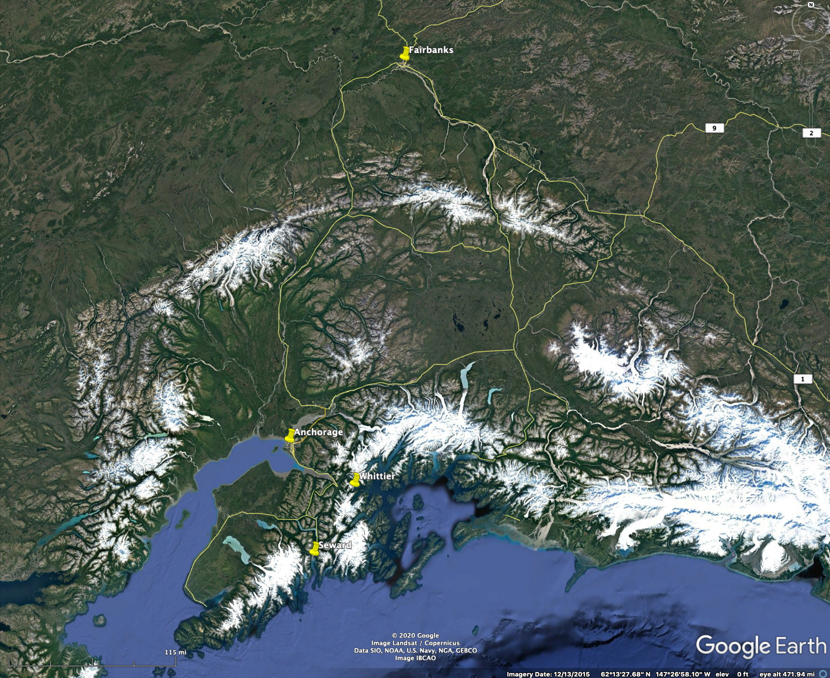 Our one (1) Alaskan land trip consisted of flying to Anchorage, renting a standard vehicle, and spending 8 days traveling around the area. Our entire route is shown on the map below, so anywhere outside this route we can say nothing authoritative. (One of us (MD) did spend about a month in Anchorage in March 1987, but that involved mostly going between a hotel and the airport – to fly into winter storms on research aircraft missions out of Anchorage. It was great for seeing the coastal mountains and glaciers from above but not much else.)