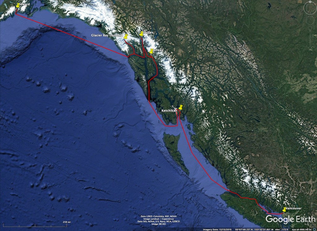 We took a Holland America cruise from Seward to Vancouver on the Maasdam, one the smaller Holland America ships (about 1200 passengers). The approximate route (I used Google Earth to trace the route) is shown here. Future cruises may be different. This cruise stopped at most of the standard ports for such cruises such as Haines, Juneau and Ketchikan. A non-port cruising day was in Glacier Bay. The key natural history aspects of each port are described below.