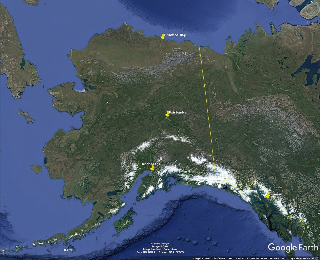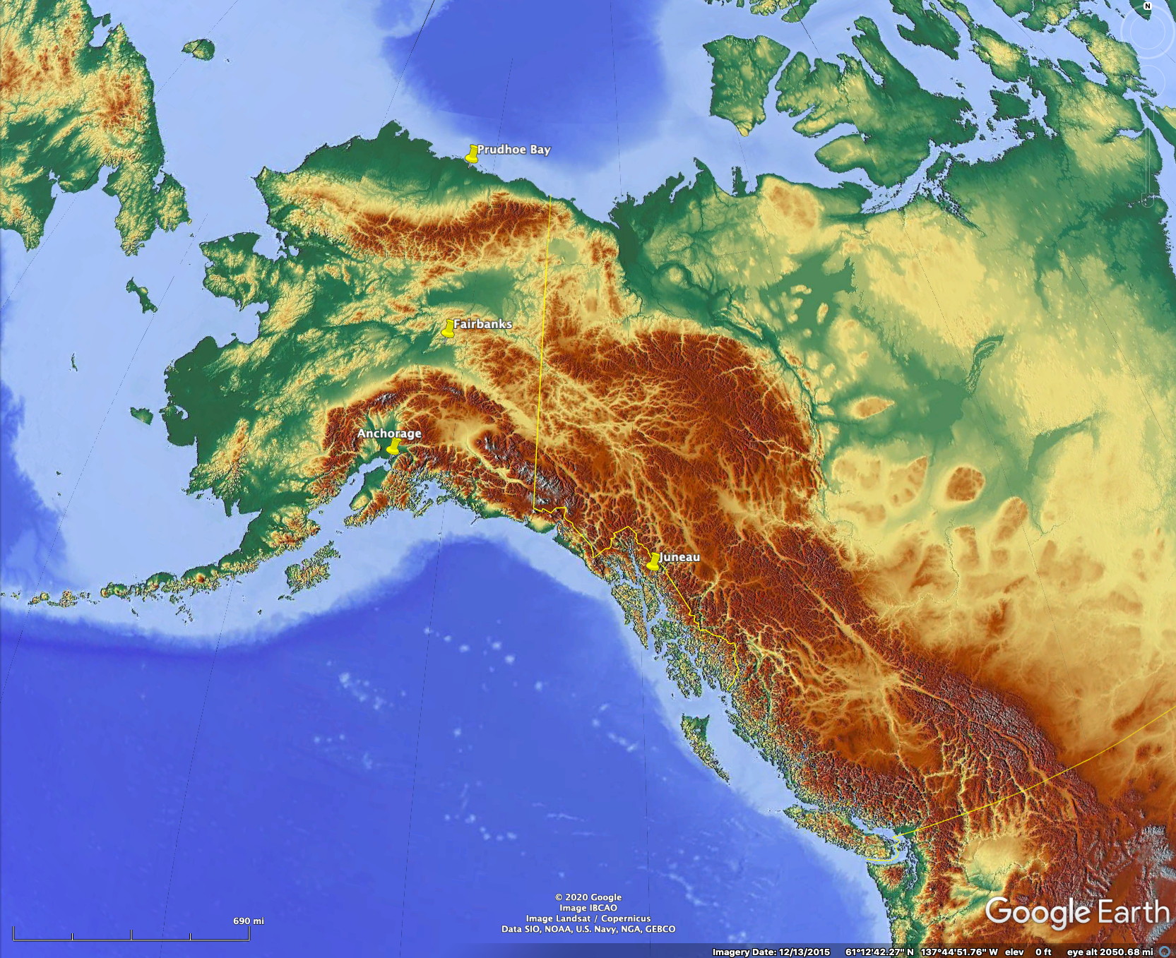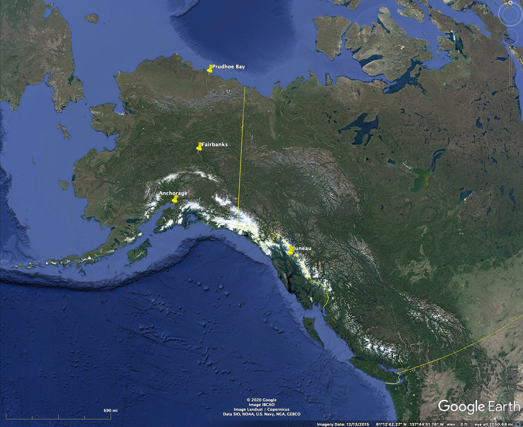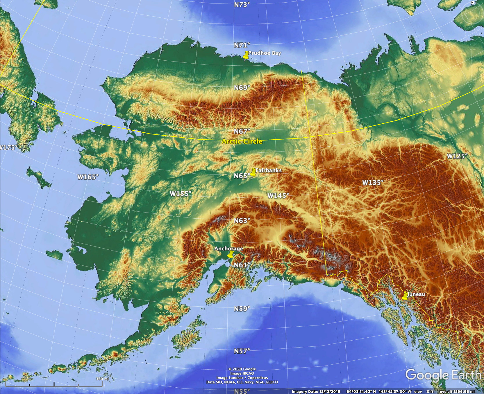 A basic map of Alaska is shown below to orient the reader not familiar with Alaska’s location and latitude. Since the rest of the US is not shown it is hard to judge its size. See here for a comparison of Alaska’s size with the contiguous (or conterminous) US.