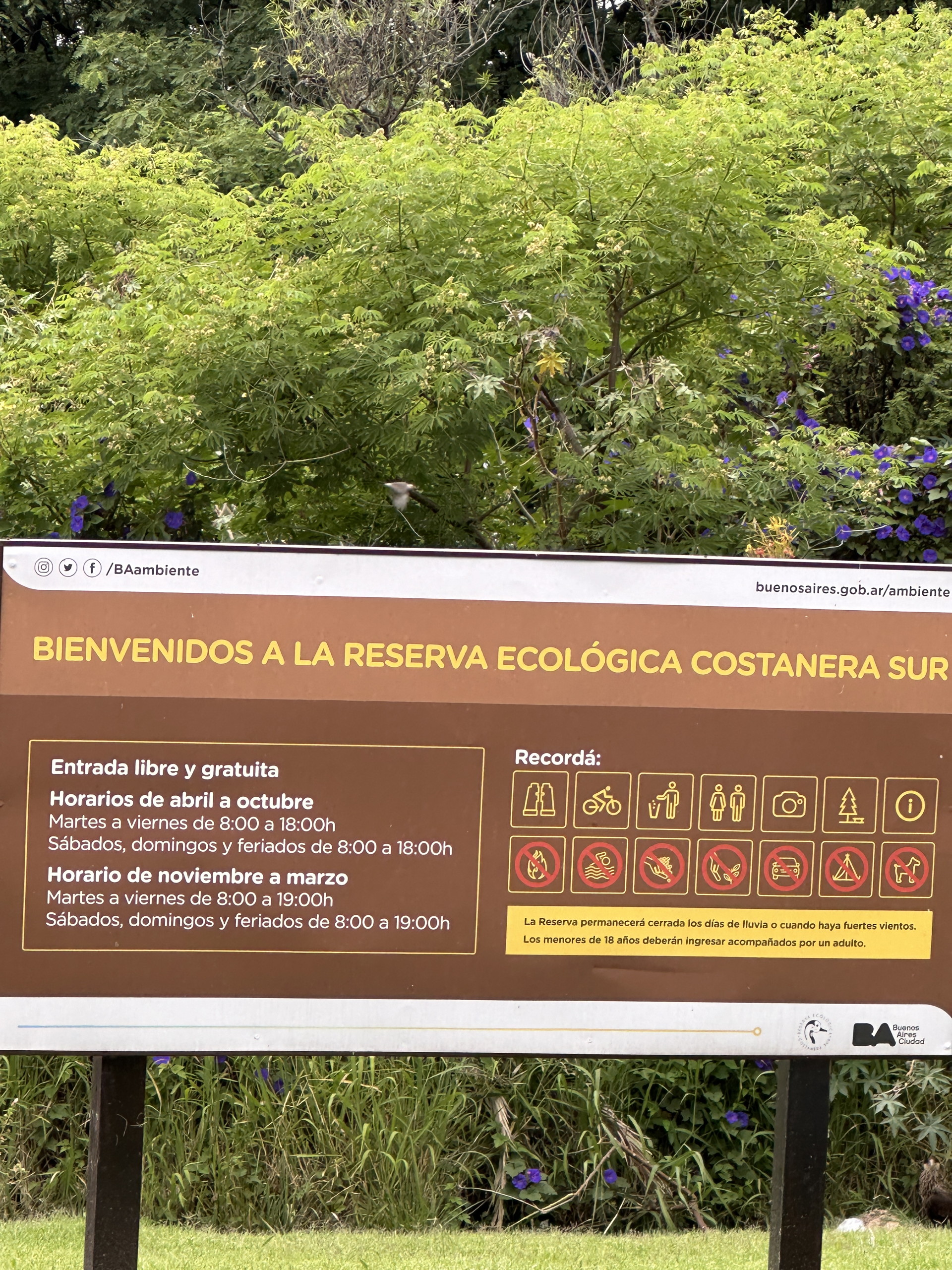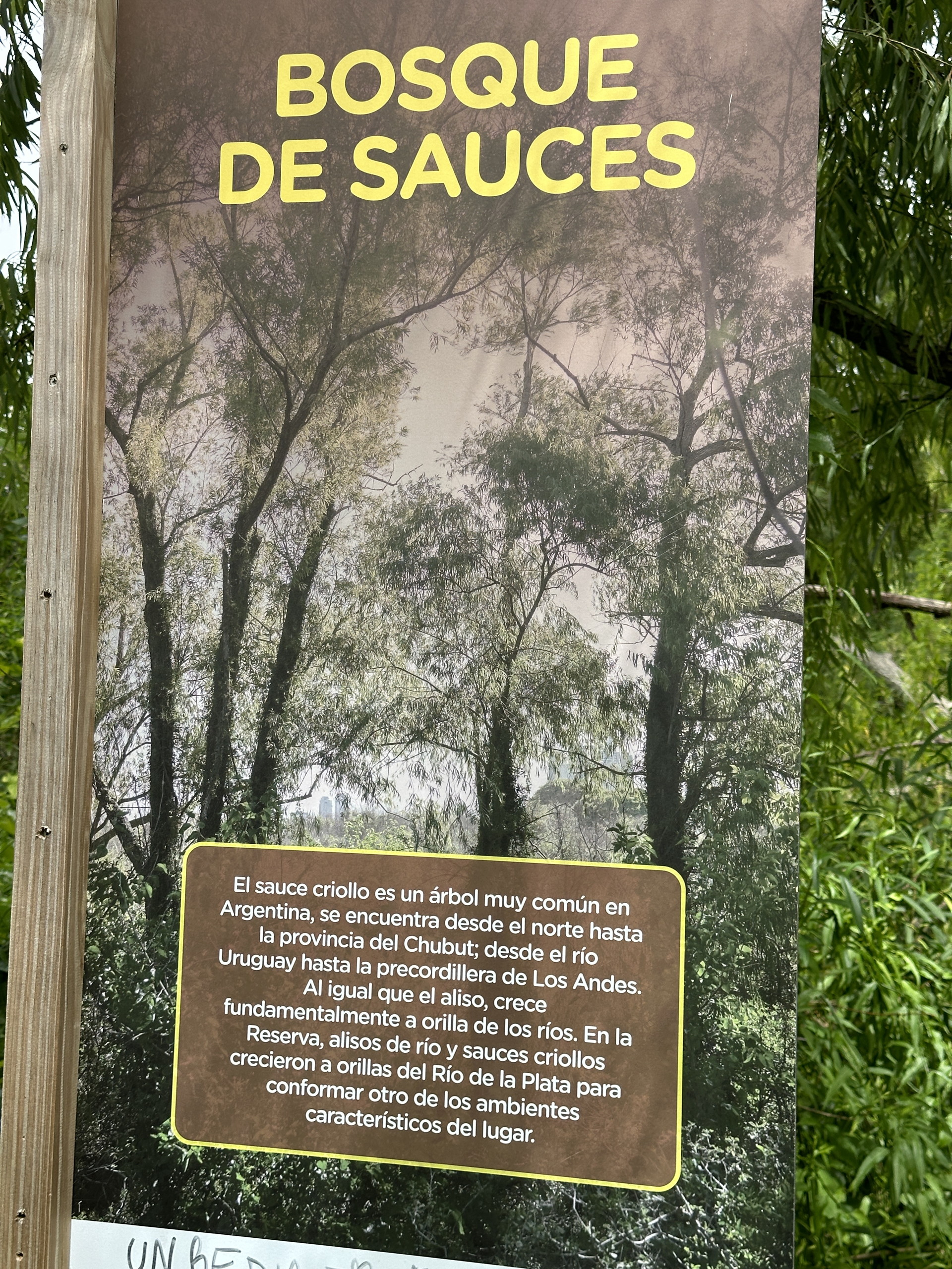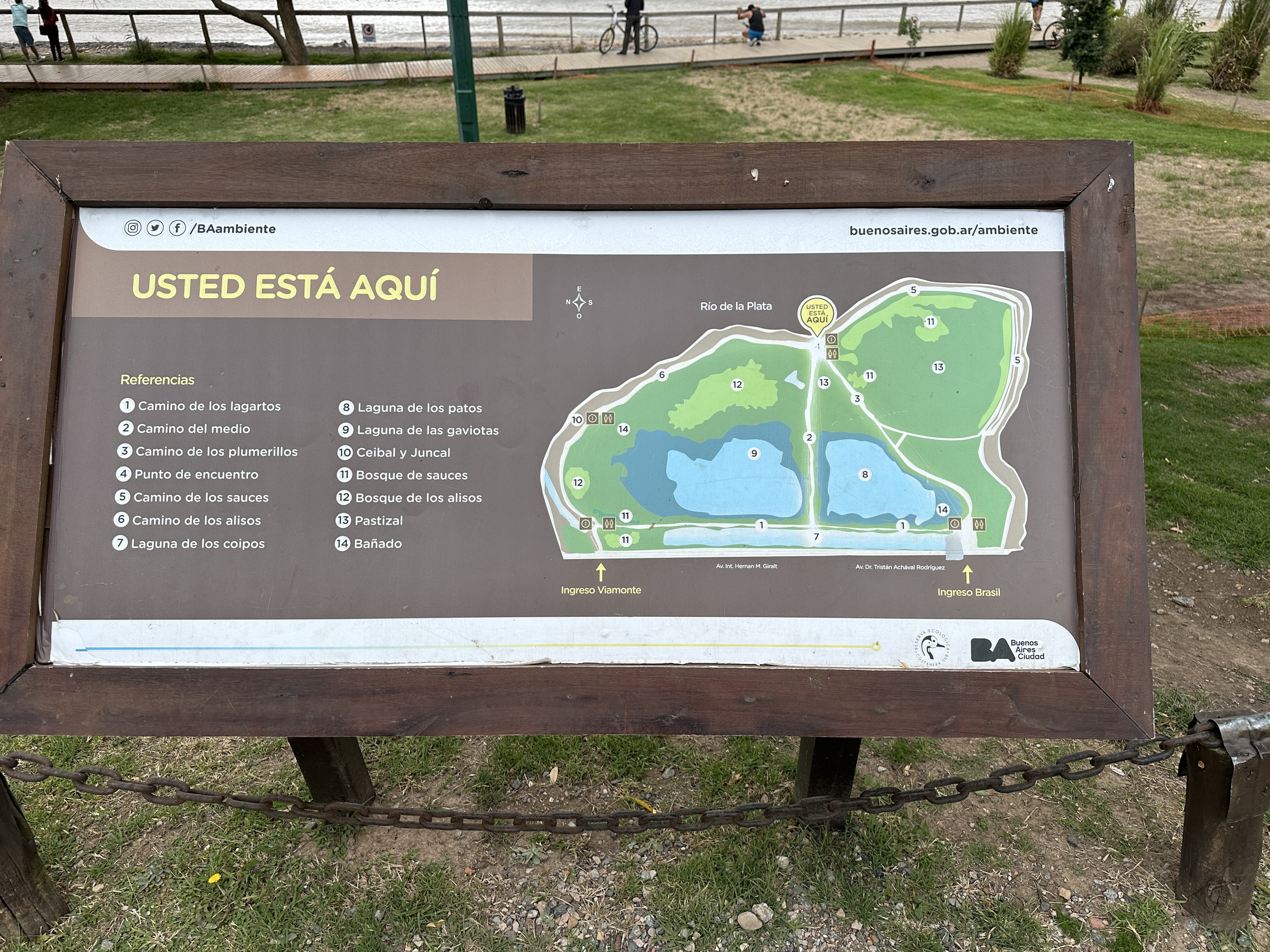 The Reserva Ecologica is an interesting place. A map (below) shows that it lies between the urban core of Buenos Aires and the Rio de La Plata estuary. The outline should give a hint of it’s origin – it is fill dirt. It’s origin lies in the era of the military junta of the 1970’s and early 1980’s. A redevelopment activity, bringing large freeways into the core of Buenos Aires, required the demolition of thousands of houses. This debris, mostly concrete and brick (since this is used for most construction in Latin America), was dumped in the river, delimiting areas that would then be filled in with debris, and eventually with river sediments. This land was to be used to expand the city eastward into the shallows of the Rio de la Plata. With the fall of the government after the Falklands war, this project didn’t happen, and the land became “abandoned to nature. In 1986 the area, about 350 hectares or 865 acres, became the Reserva Ecologica Costanera Sur. Thus, for about 40 years it has been gradually developing, with a mix of trees, grasslands, and wetlands becoming slowly more “natural”. It is now heavily used by porteños for walking, jogging, and escaping from the urban bustle. It is closed one day a week (Monday) for maintenance, and is closed at night.
