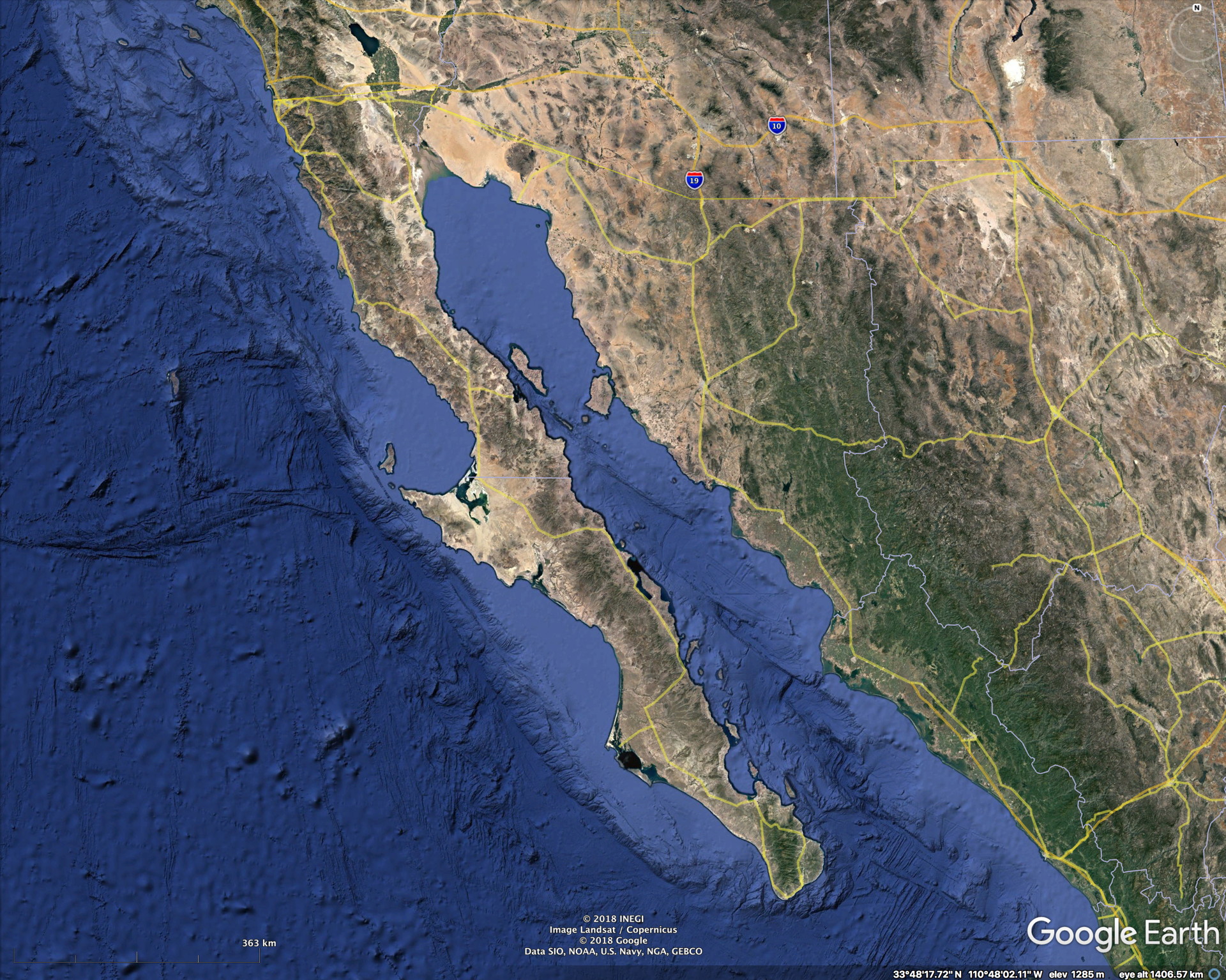 Overview maps of the Baja California peninsula are shown in Figs 1-3. Politically, Mexico’s Baja California peninsula is divided at the 28˚N latitude line into two states – Baja California and Baja California Sur. Most of the peninsula’s population resides in Tijuana (next to San Diego) and Mexicali (next to US border) in the Imperial Valley. Large towns, of several hundred thousand people are Ensenada (about 70 miles south of Tijuana) and La Paz, in the far south of the peninsula. Los Cabos and San Jose del Cabo are the main fly-in tourist destination and are at the tip of the peninsula and they have been growing rapidly in recent decades, but are smaller than the cities mentioned above.