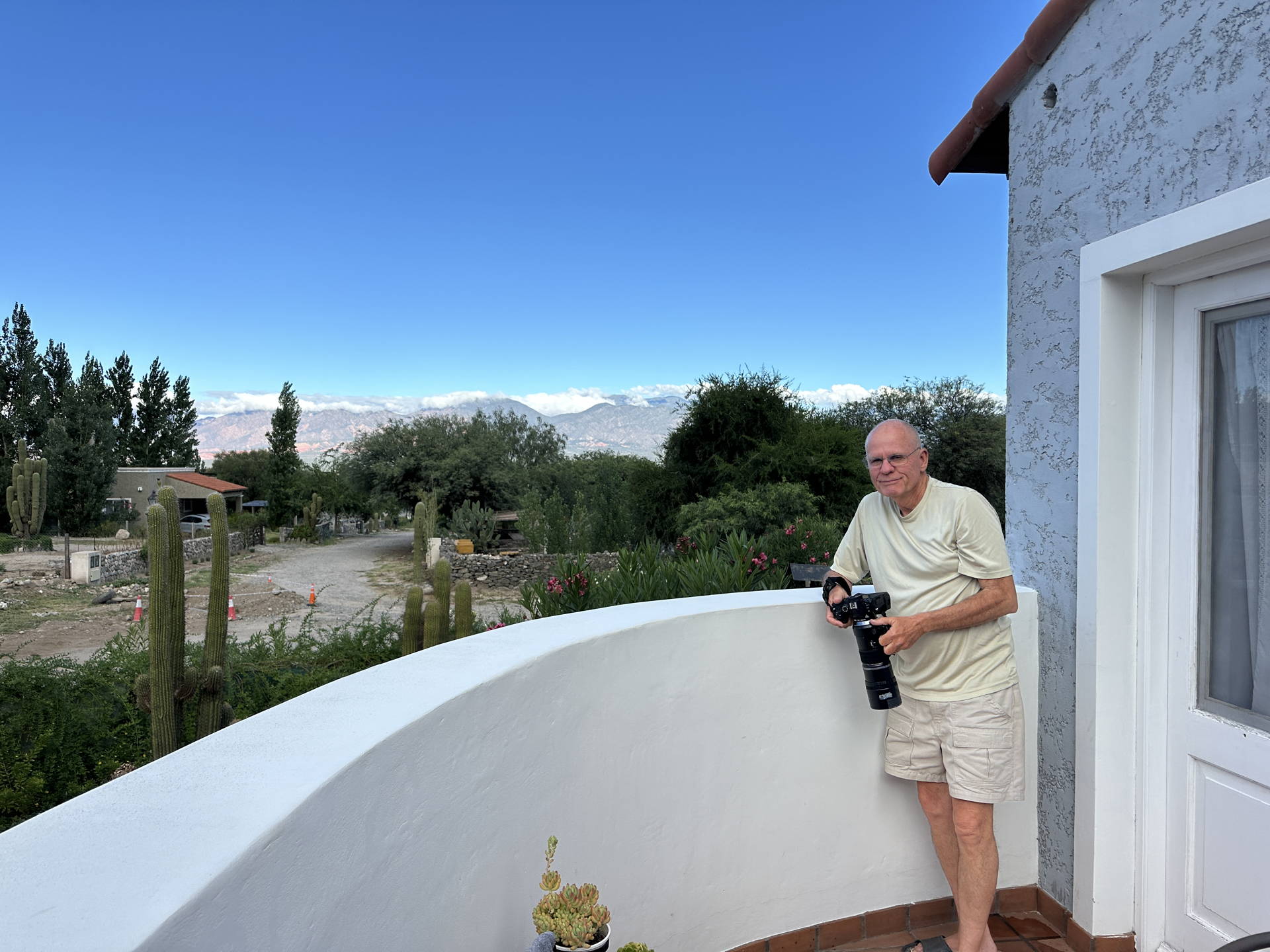 Cafayate, at about 4500 ft elevation, is a relatively warm and dry small town. It is surrounded by vineyards and bodegas that attract tourists. We stopped here because the drive from Salta to our next 3-night stay outside Catamarca was too long to do in one day. The drive through the canyon north of Cafayate is very scenic, and relatively lightly traveled. We didn’t have too much hope of finding (online) a place suitable for insect-watching, and we settled on a nice place that was upstairs from the owner’s space. It was very nice and had an outside patio where we set up our insect-watching items (lights, cage, and folding chair we brought with us. The chair is needed for sitting while composing insect shots along the side of the cage.