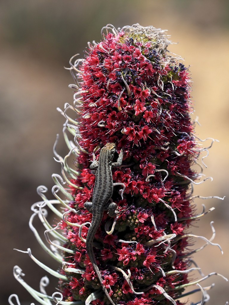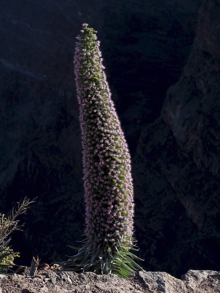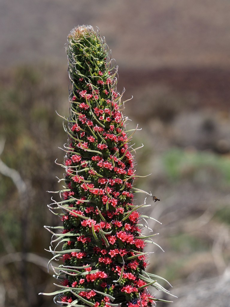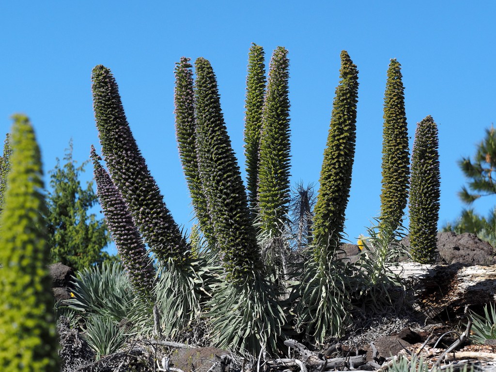 Aeonium attracts much attention from botanists visiting the Canary Islands but members of the Boraginaceae are prominent at higher elevations – above the low cloud zone. Echium wildpretii, a biennial, is prominent around the base of El Teide on Tenerife and the subspecies E. wildpretii sps trichocaulon with blue flowers is easily seen on La Palma around the upper rim of the Caldera de Tuburiente. When they are flowering in May-June these plants attract very large numbers of bumblebees.