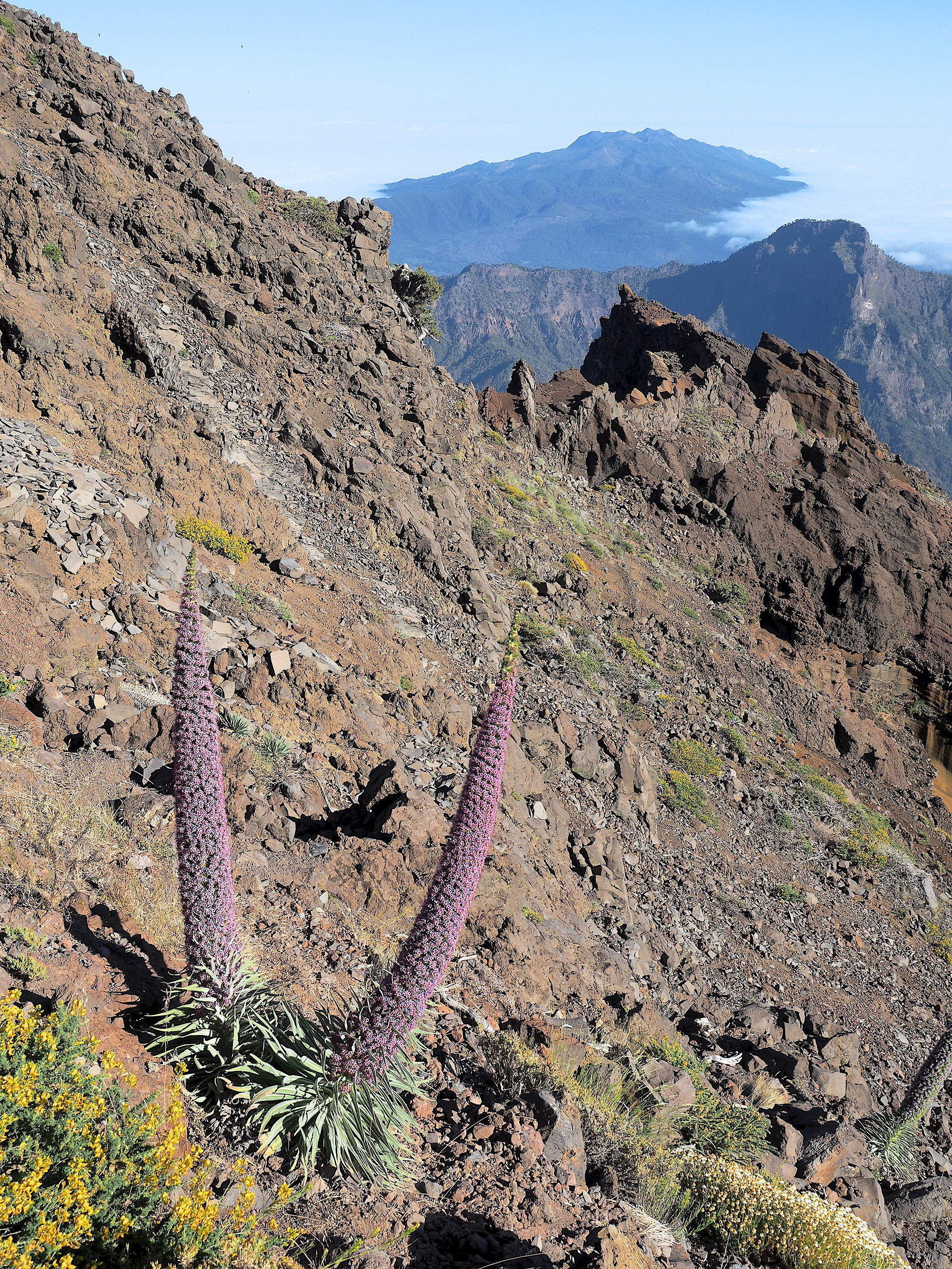 Aeonium attracts much attention from botanists visiting the Canary Islands but members of the Boraginaceae are prominent at higher elevations – above the low cloud zone. Echium wildpretii, a biennial, is prominent around the base of El Teide on Tenerife and the subspecies E. wildpretii sps trichocaulon with blue flowers is easily seen on La Palma around the upper rim of the Caldera de Tuburiente. When they are flowering in May-June these plants attract very large numbers of bumblebees.