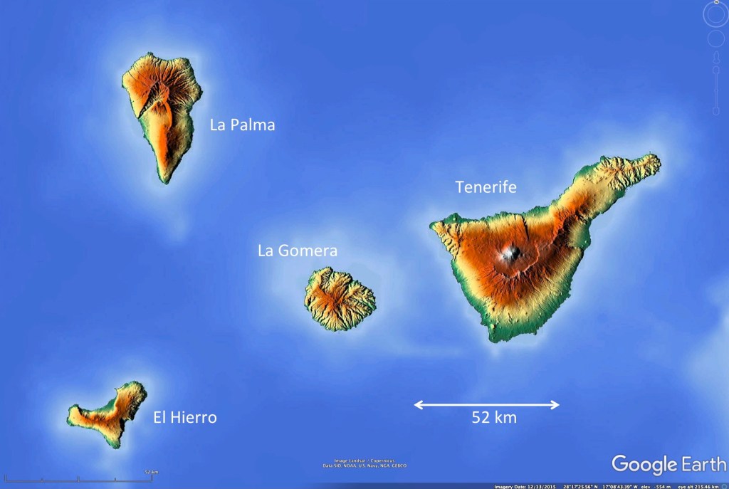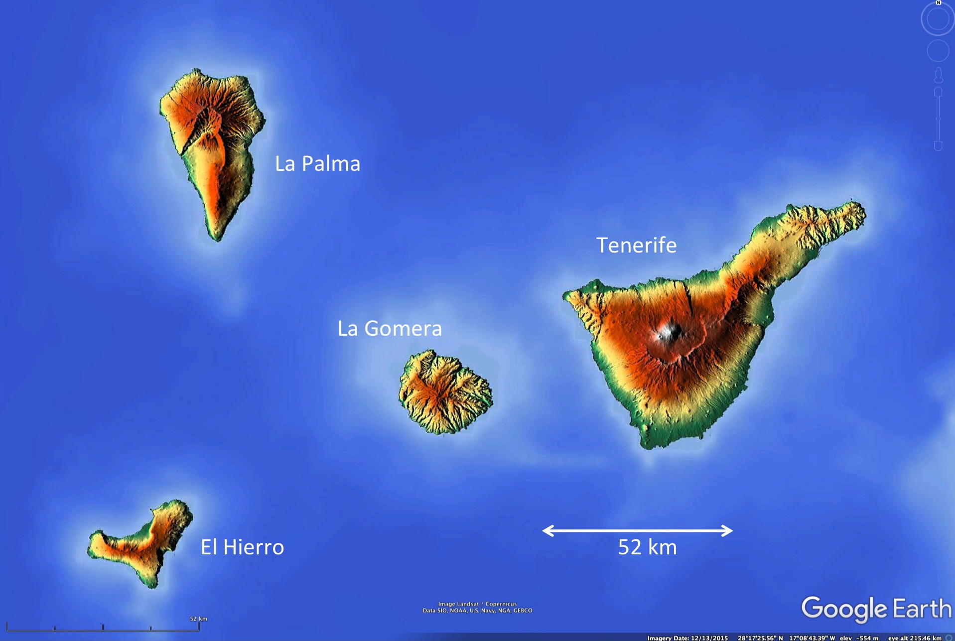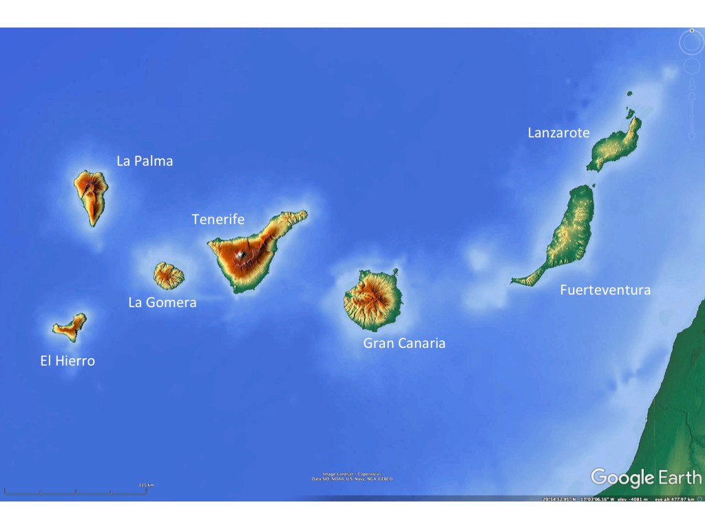 The Canary Islands are not well-known as a natural history destination to most Americans. The European community is more familiar with them because of their proximity and their touristic attractions. Here we describe some basic aspects of the geography of the islands. An authoritative, excellent source of geographical information of the Canary Islands, both cultural and natural, is the Canary Island Government GIS mapping page at: https://visor.grafcan.es/visorweb/ I would urge naturalists to explore the multitude of layers that are available for the islands and high spatial resolution. Some of the images discussed below are taken from screen captures generated from this website.