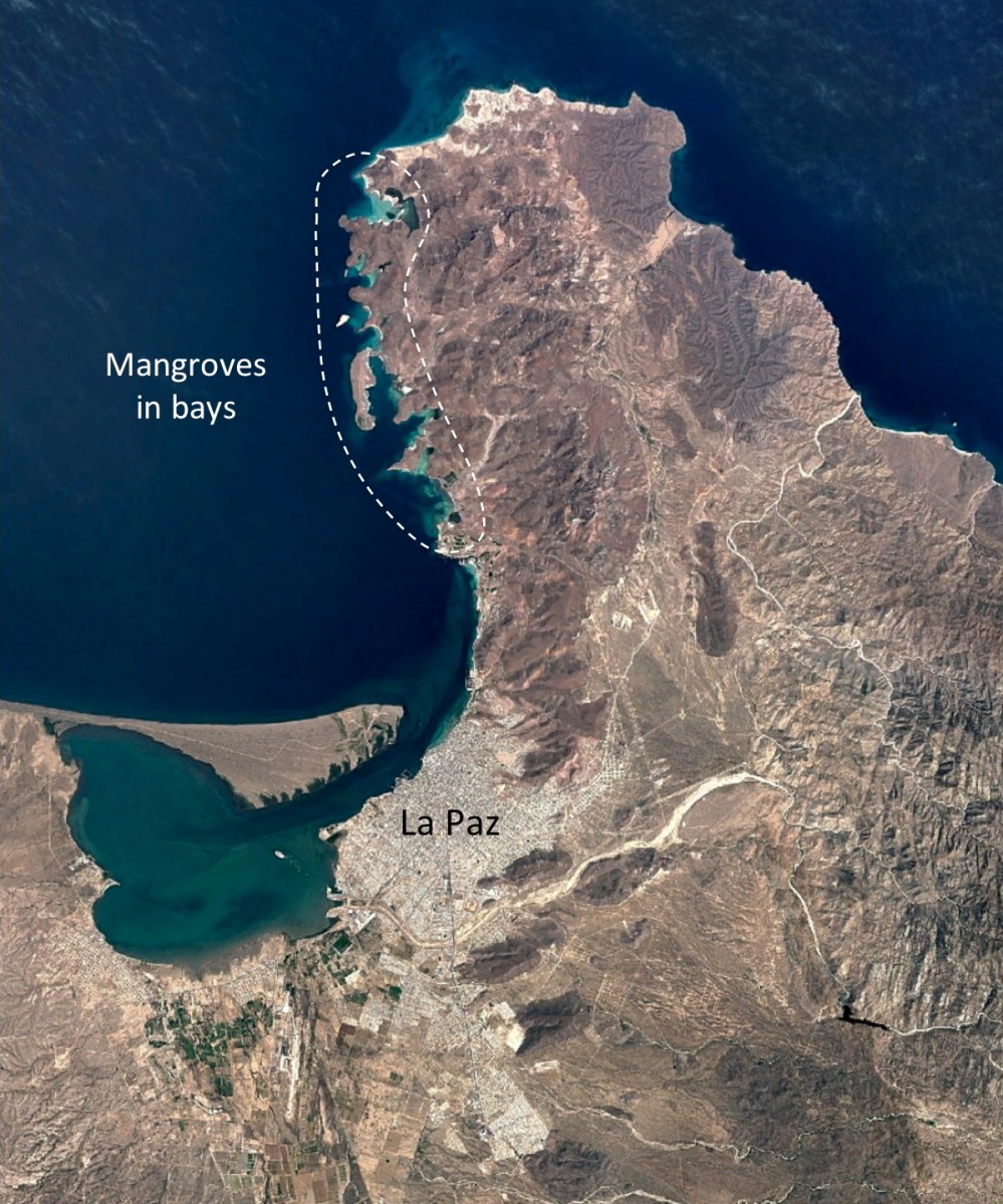 The region of La Paz in the Cape Region of the Baja California peninsula. The area enclosed by the dashed line is a region of small bays with mangroves. A road runs past these on the way to the north end of the peninsula shown here.