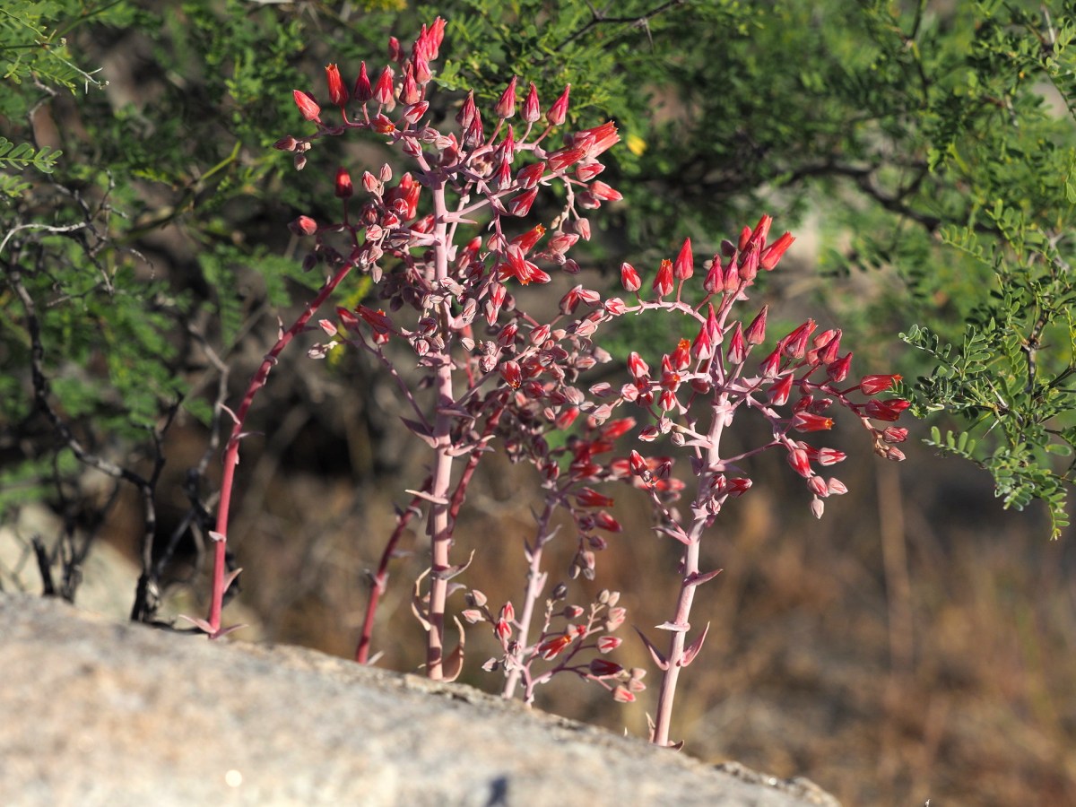 Among the granitic boulders are succulents of the genus Dudleya (family Crassulaceae). Here are the flower stalks – the plants themselves are hidden from view.