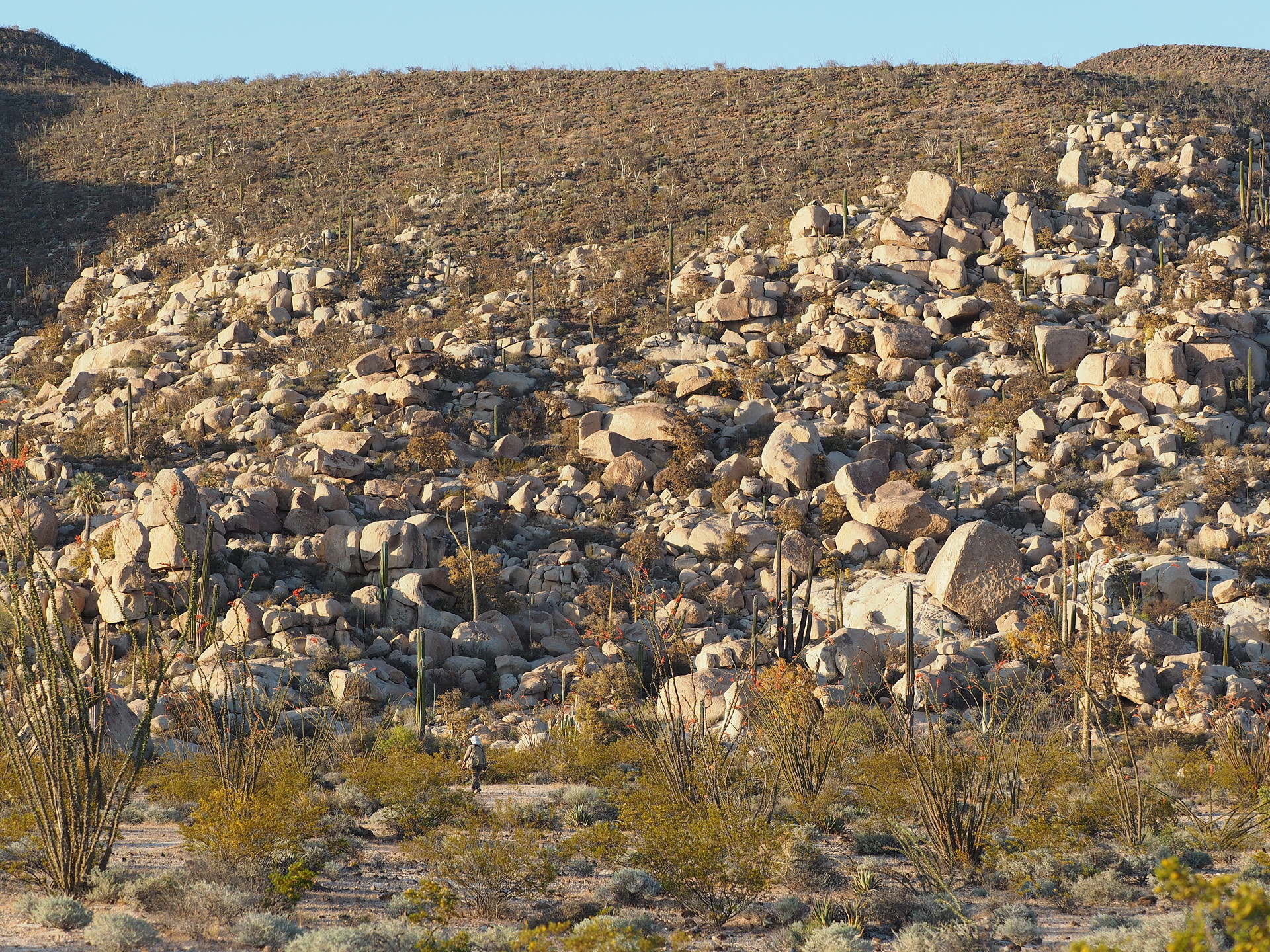 Landscape near Cataviña showing both volcanic rock substrate (at top) and granitic substrate (below). Note the very different development of vegetation on the two substrates.