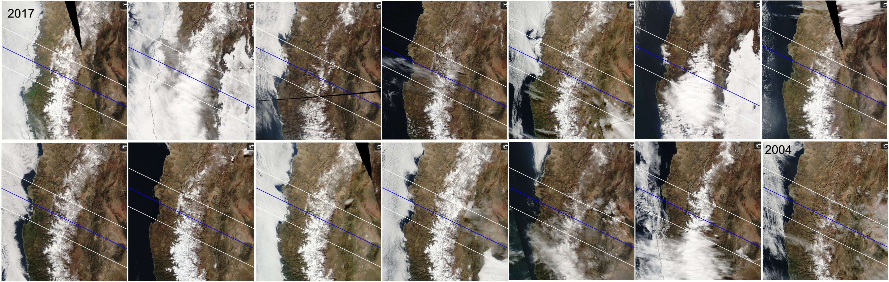 I have saved the reader a bit of effort and produced a mosaic that shows the cloudiness at 130PM local time on July 2 for the past 14 years – over the Chilean coast and western Argentina – along the eclipse path. The mosaic is below (be sure to click on the image to see a large version). The blue line is the eclipse centerline (the lines are approximate…)