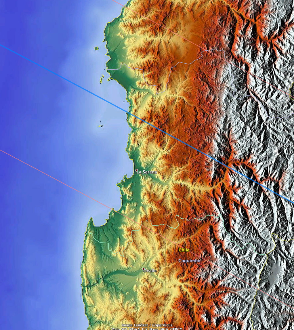 Screen Shot 2017-12-30 at 8.48.08 PM ← Previous Next → Shaded relief map of area shown in next two images. Total eclipse (July 2 2019) centerline is blue and borders of totality are red lines. Like Loading...