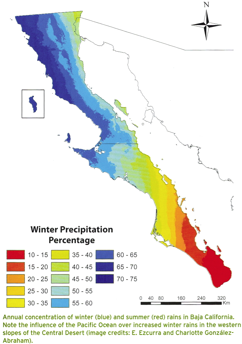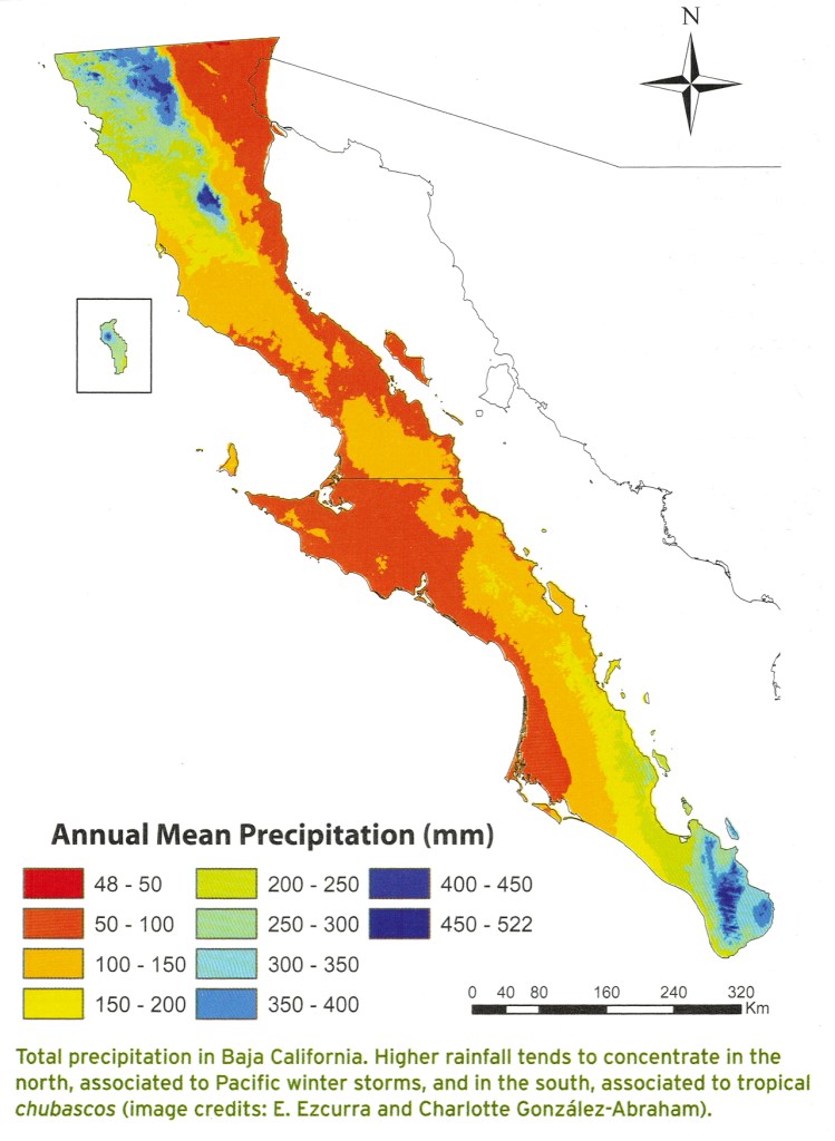Since rainfall from winter storms diminishes southward in Baja California and the mountain height also diminishes on average the rain shadow effect is less apparent in southern Baja California.