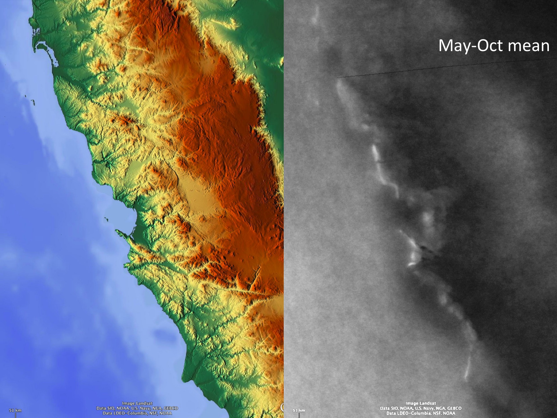 The importance of coastal low clouds and their diurnal variation can be seen in this video or this video (you must download and open in Quicktime for a full resolution view). The clouds usually “burn off” in the late morning, depending on the day. (“Burning off” isn’t exactly a correct explanation for why the clouds dissipate – the “mixed layer” deepens due to daytime heating over the land and at some point the relative humidity at the top of this mixed layer drops below saturation and the clouds dissipate. There is much more to this subject but it’s not appropriate to digress too much here.)