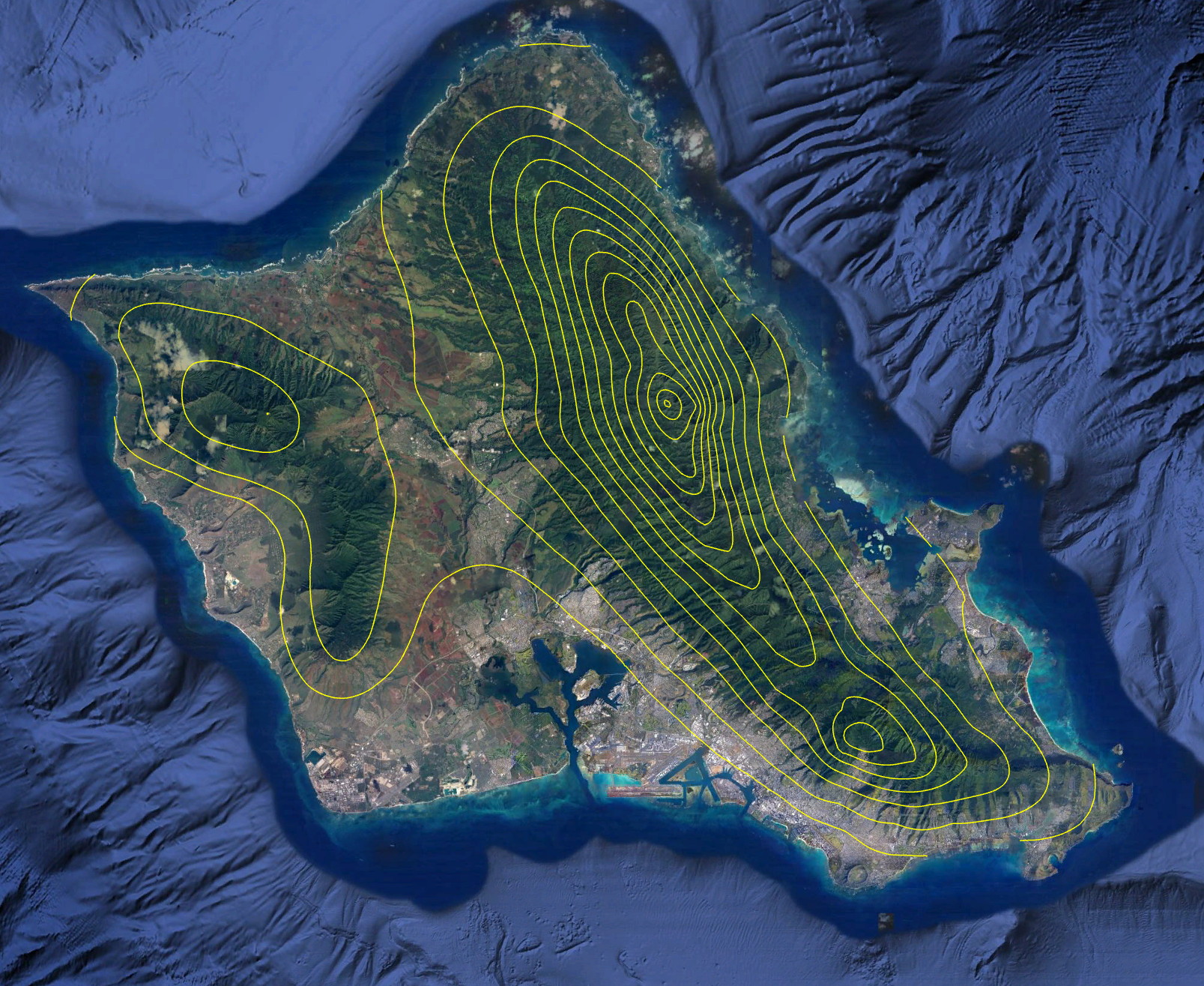 Aspects of the climate of Oahu are shown below. Step through the images to see the mean annual rainfall from the Rainfall Atlas of Hawaii as well as satellite and shaded relief depictions of the island. The figure captions explain in more detail each image.