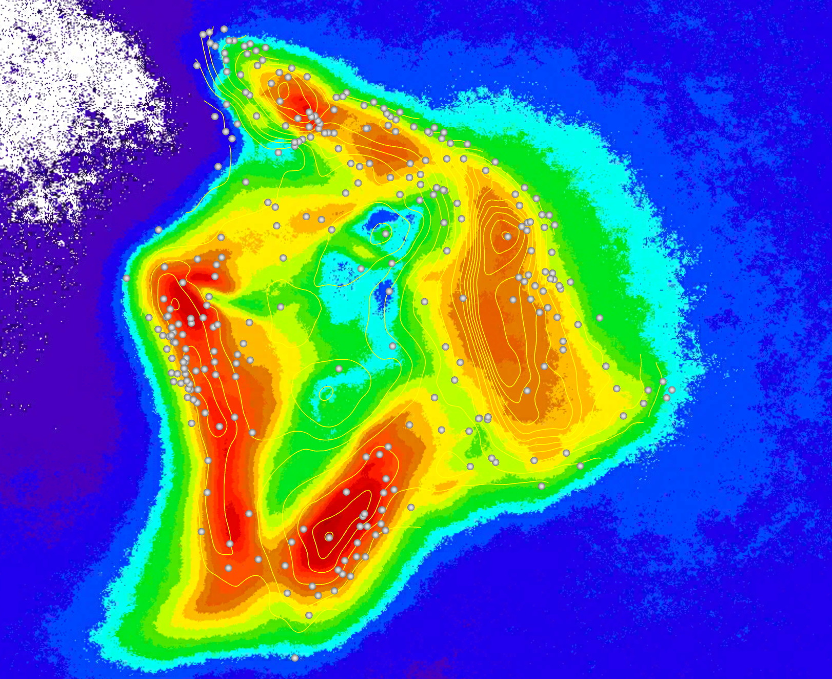 The figures below show the mean annual rainfall for the Big Island, along with mean cloudiness and the shaded relief and true color surface characteristics from Google Earth imagery. These are explained more fully in the individual captions.