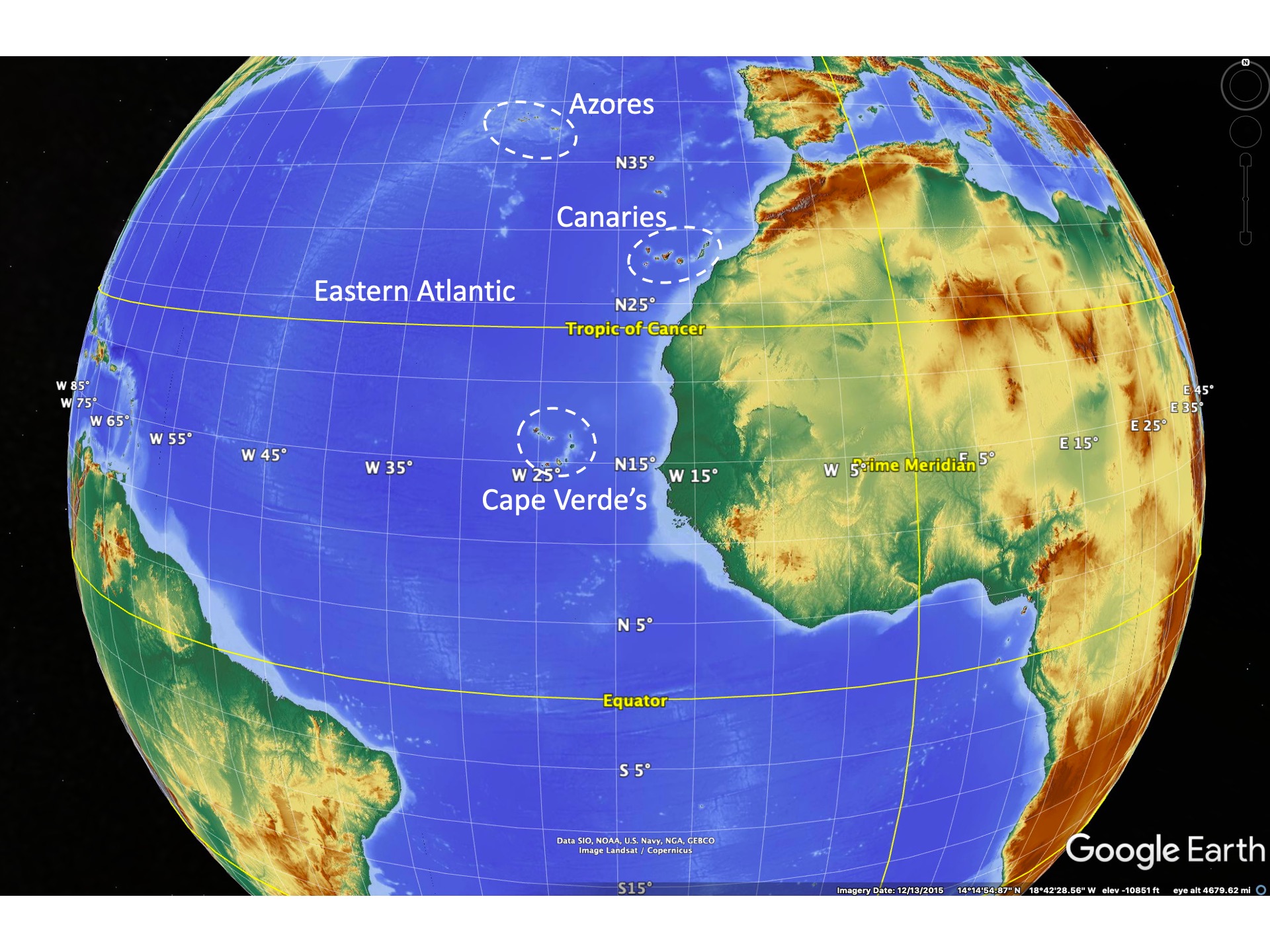 The islands we discuss here are shown schematically in the following figures. We don’t attempt to explain their distribution via plate tectonic theory; such explanations can be found in many places elsewhere. The focus here is on showing that islands modify their climatic environment to varying degrees, based on their size, relief and other features. The focus will be on using specific islands as examples of concepts that can be applied to generalized islands almost anywhere on Earth.