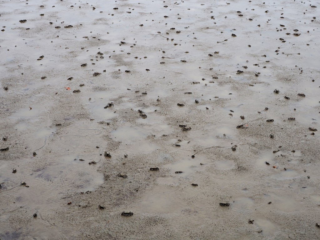 A variety of birds and other organisms such as crabs take advantage of the low tide to look for food.