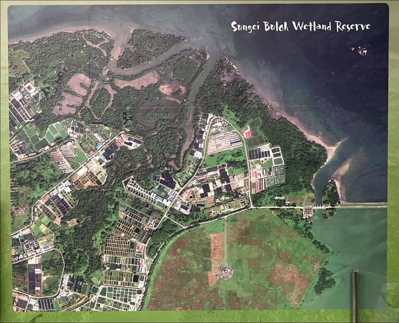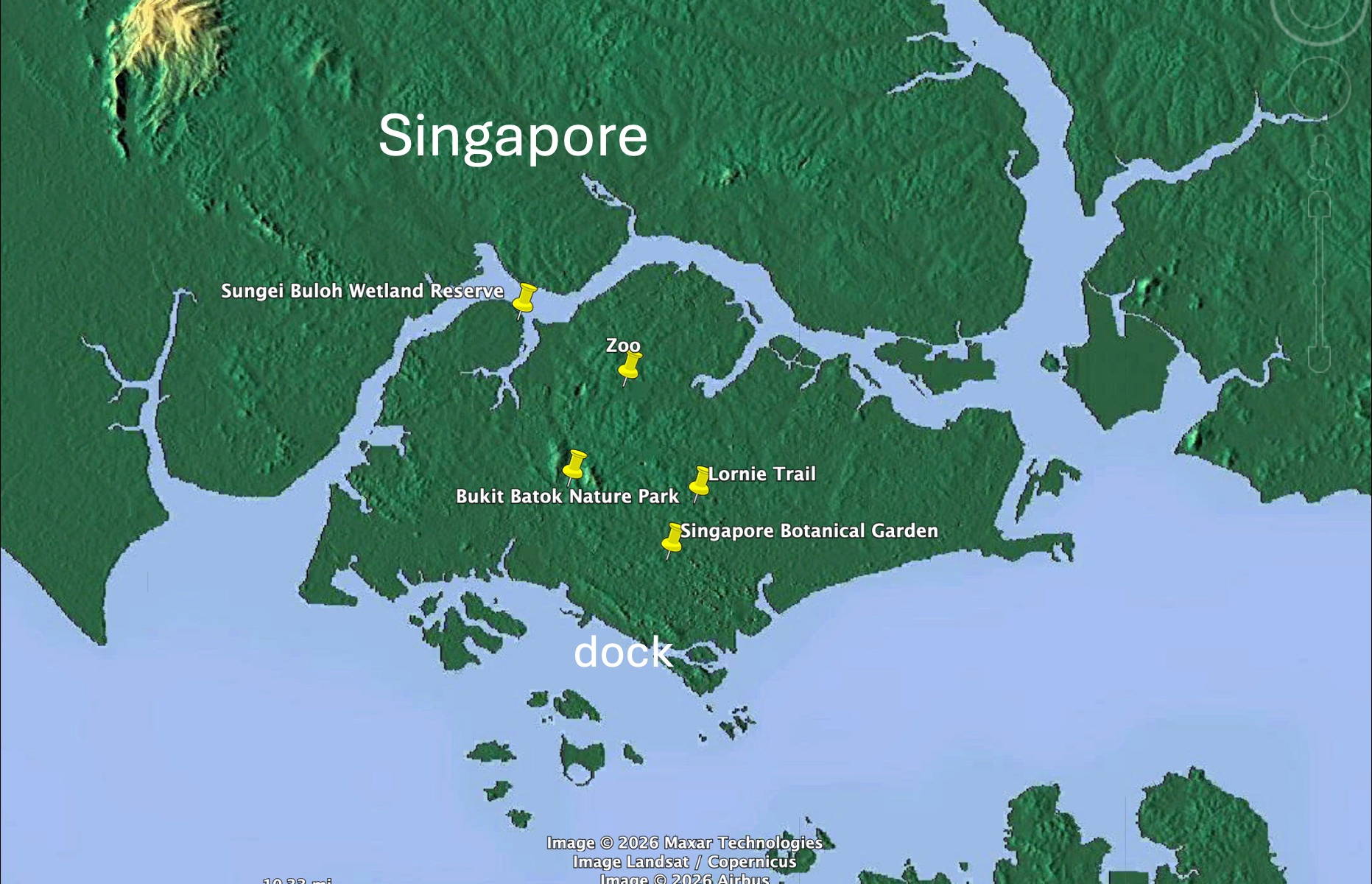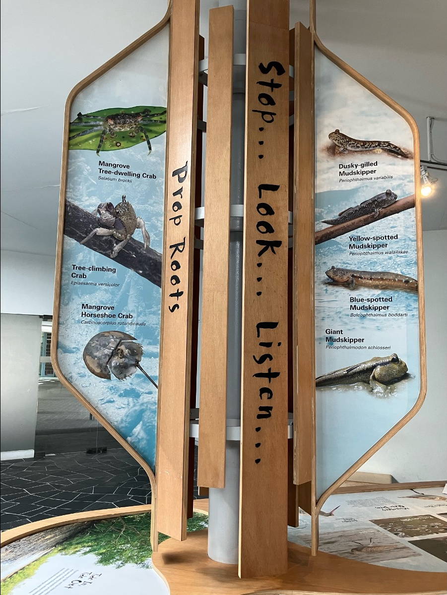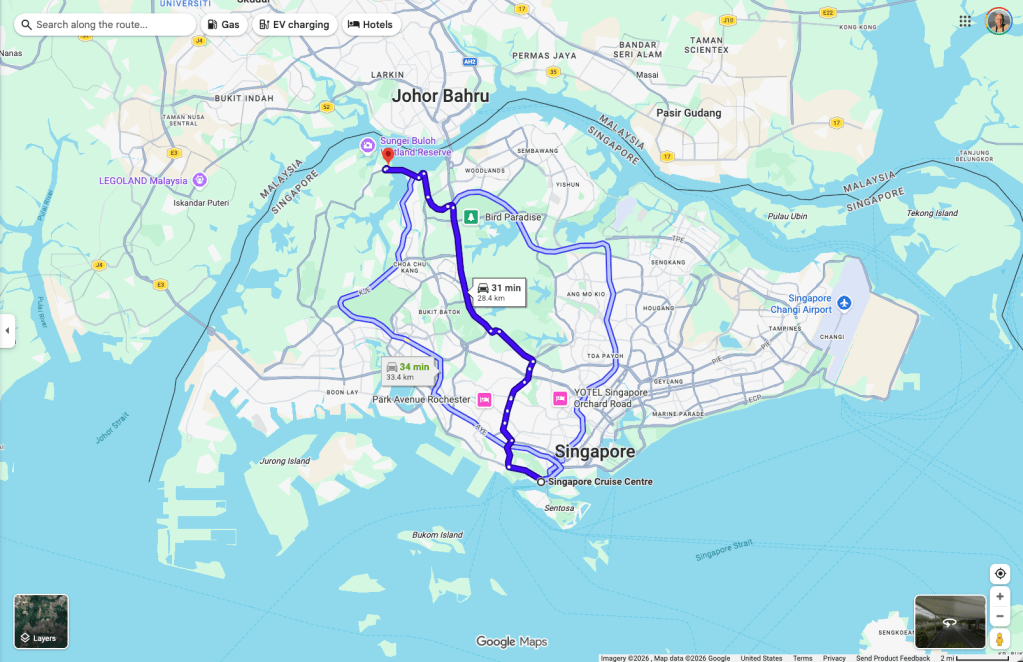 Singapore had the best facilities for the nature parks (and probably pretty much anything else) we tried to visit on our cruise . But it is just large enough to make getting around somewhat time consuming – though the roads were excellent and the traffic not excessive. The map below shows the route we took to the Sungei Buloh Wetland Reserve on the north side of Singapore. It is just a stone’s throw (perhaps superhuman one) from Malaysia. One of the down sides of this location is that, despite Singapore being very clean, Malaysia isn’t quite as clean, and there was lots of floating trash in the waters of the reserve.
