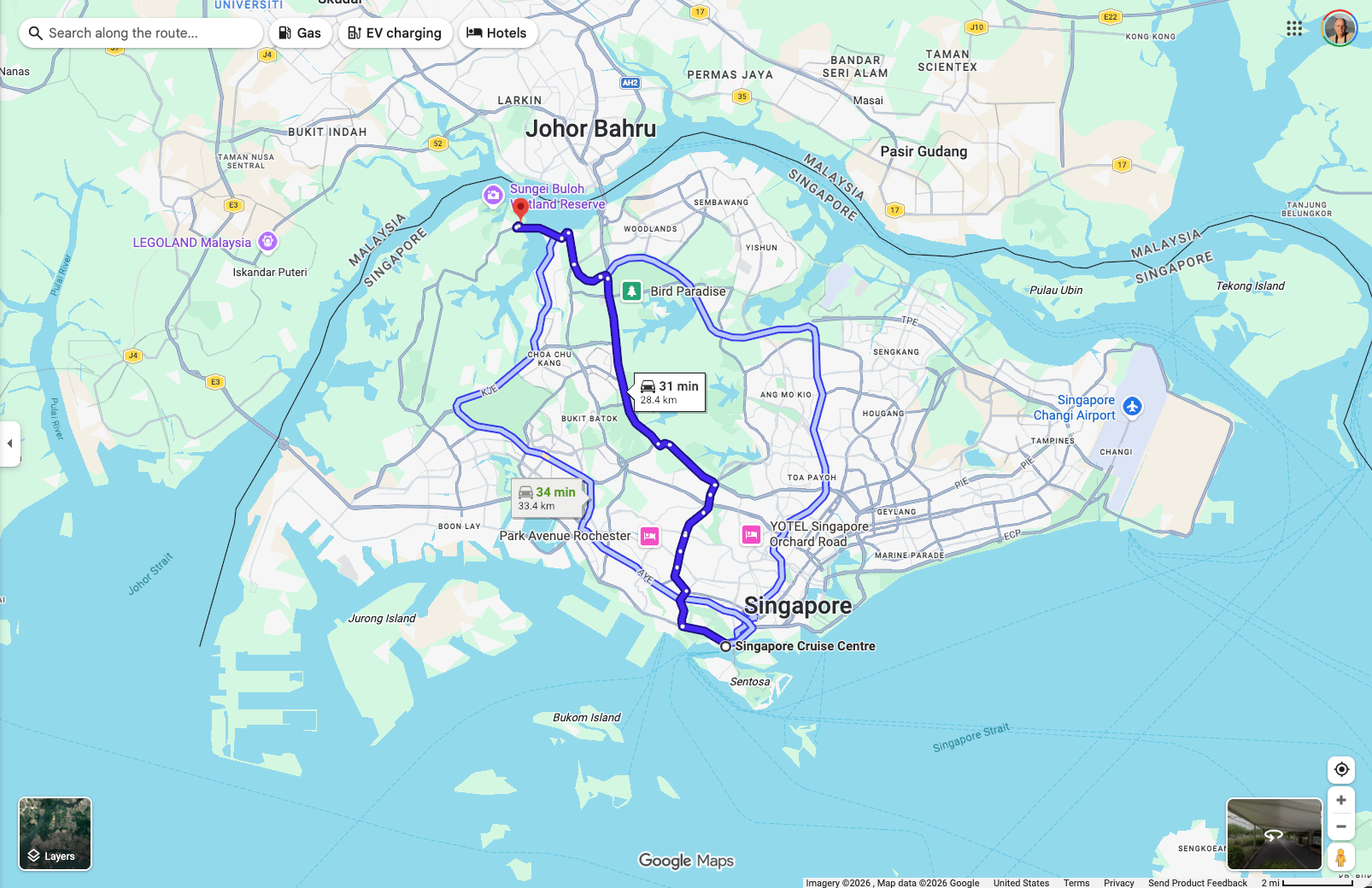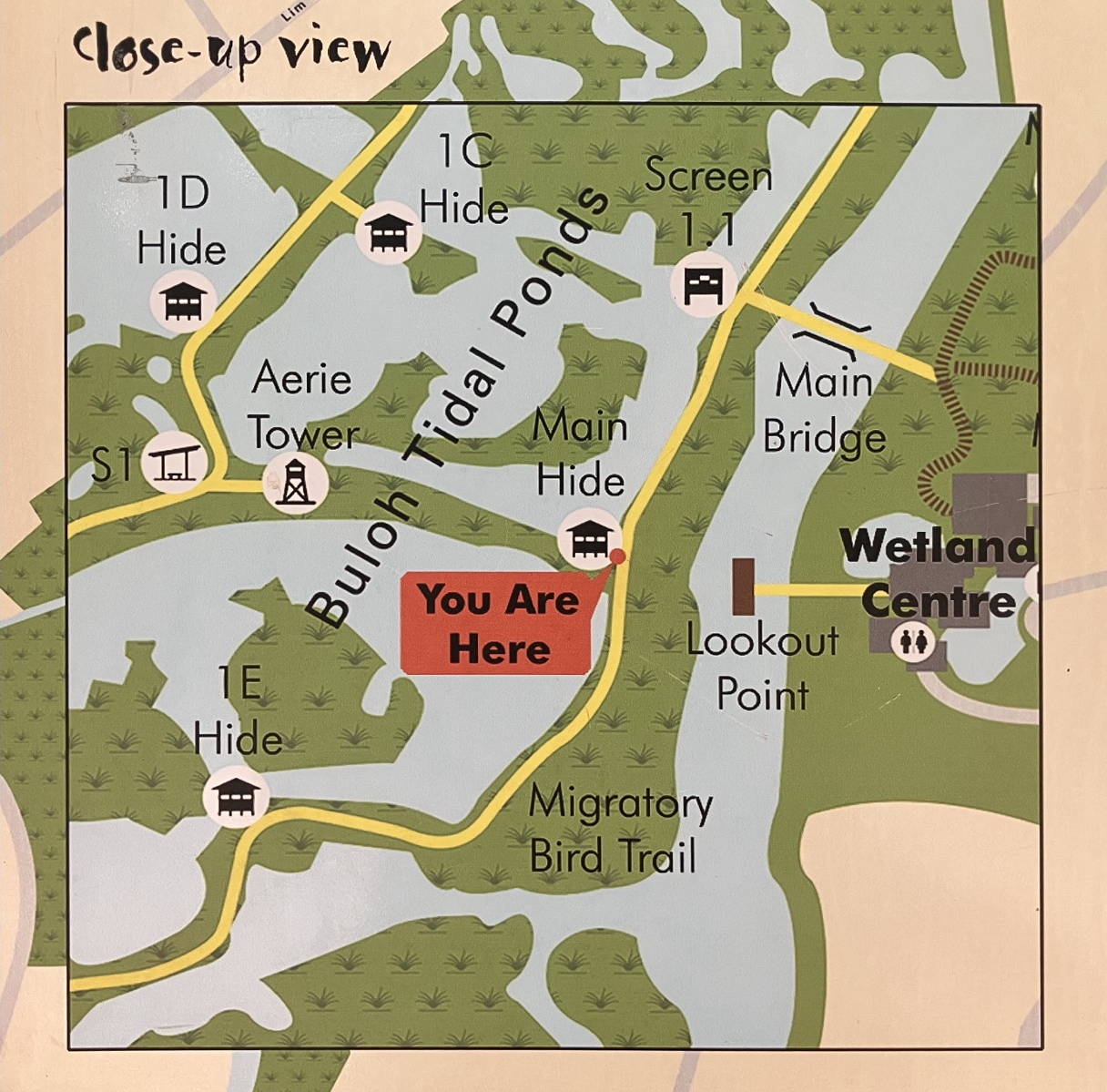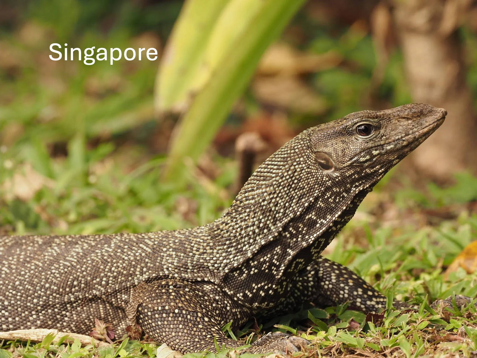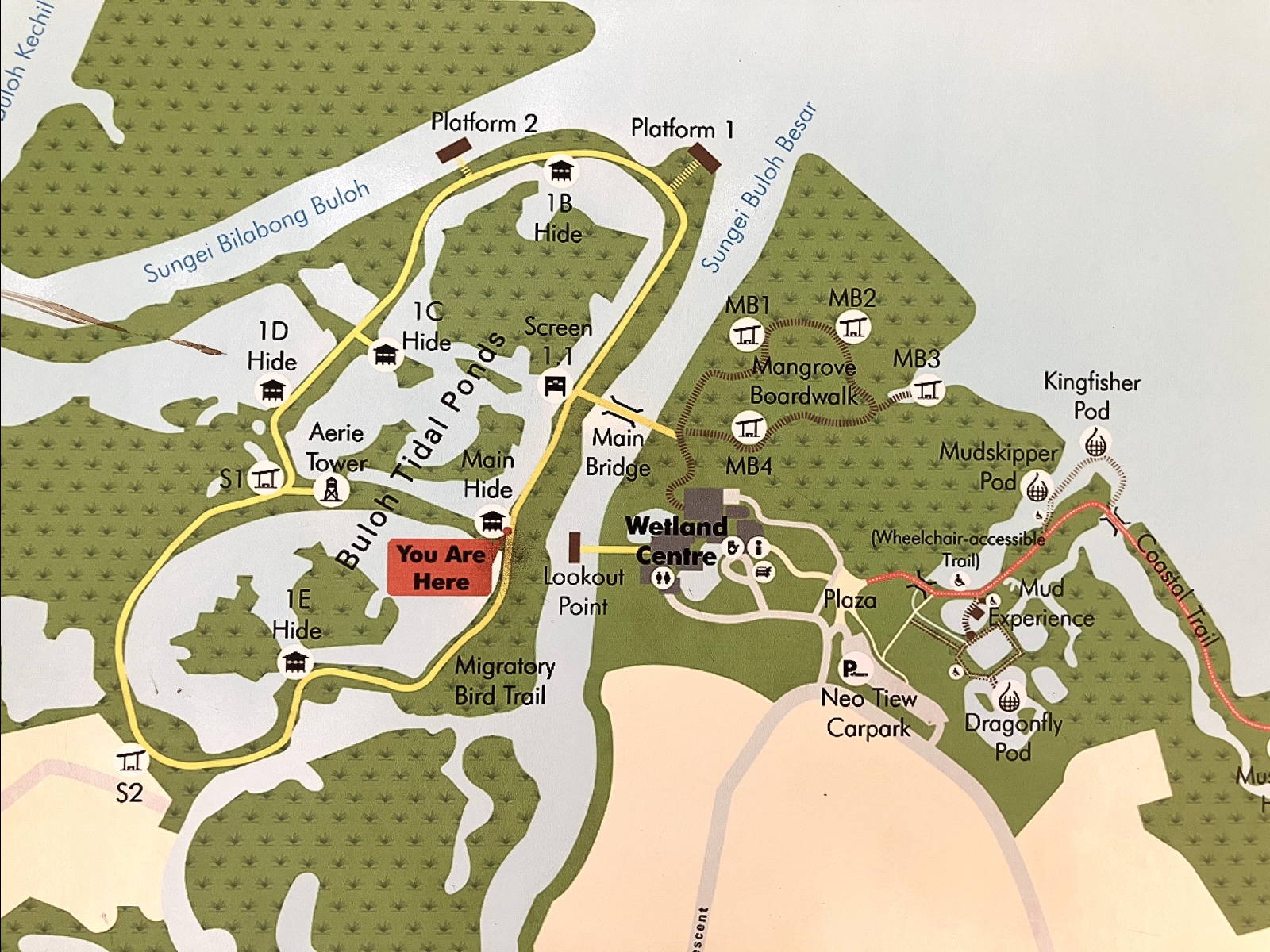 Singapore had the best facilities for the nature parks (and probably pretty much anything else) we tried to visit on our cruise . But it is just large enough to make getting around somewhat time consuming – though the roads were excellent and the traffic not excessive. The map below shows the route we took to the Sungei Buloh Wetland Reserve on the north side of Singapore. It is just a stone’s throw (perhaps superhuman one) from Malaysia. One of the down sides of this location is that, despite Singapore being very clean, Malaysia isn’t quite as clean, and there was lots of floating trash in the waters of the reserve.