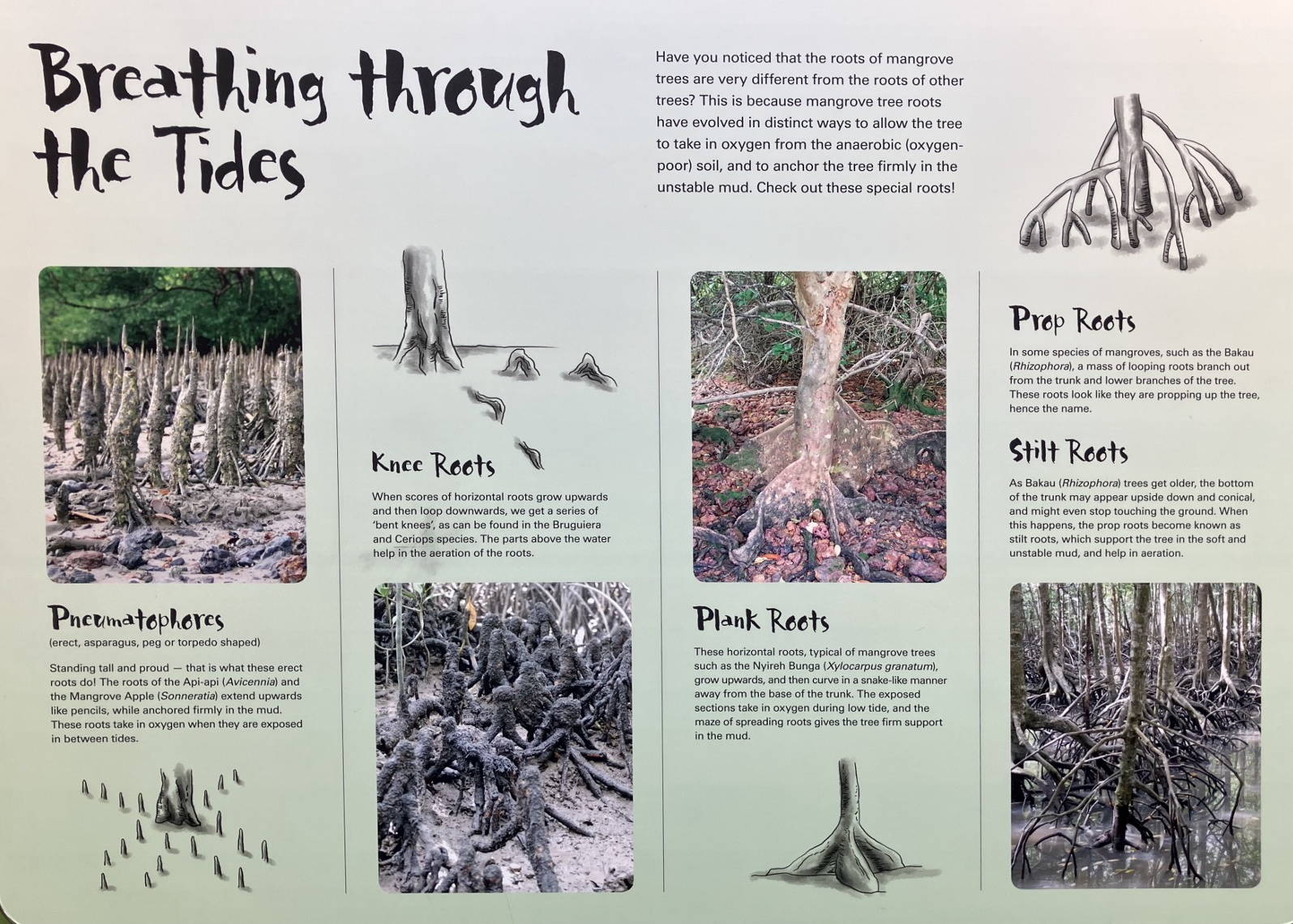 We have visited the mangrove boardwalks three times – each time seeing different things. Hundreds of photos. There are a half-dozen different mangroves found there – quite interesting zonation due to subtle salinity differences between the inland parts and the open shore. I’m into mangroves and give talks on this subject, but here I’m just going to say that you should go and see for yourself. Don’t try to walk there! It is a bit too far and too warm.