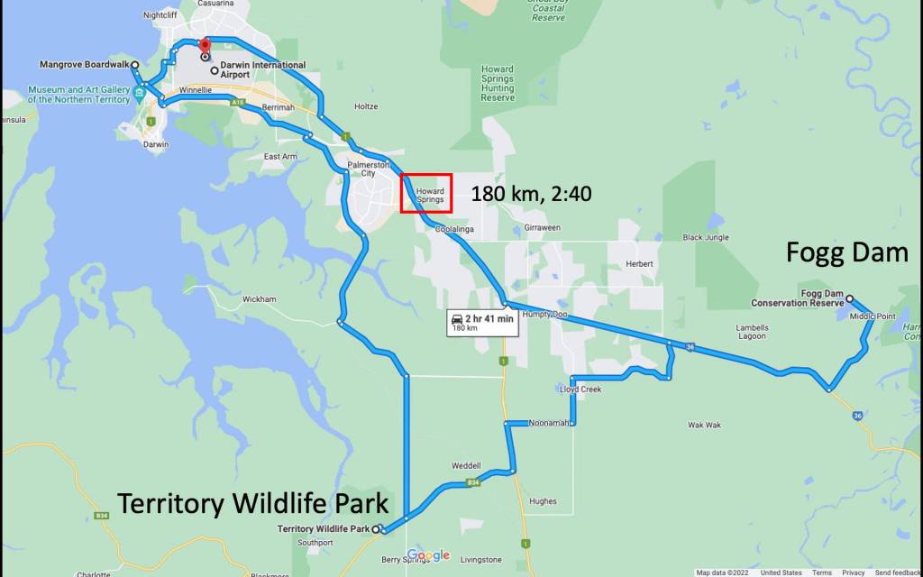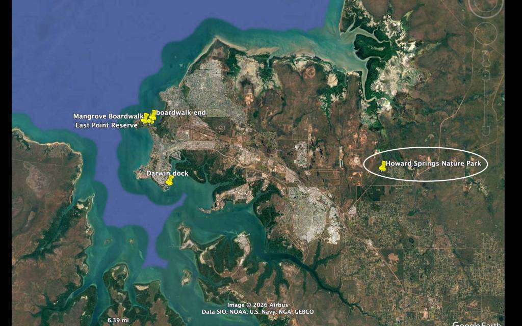 A place we discovered on our last trip to the Darwin area (we spent 10 days there before a cruise across the Indian Ocean) was the Howard Springs Nature Park. This has nice trails (good for birding) with lots of informational plaques. Howard Springs is closer (30 km) to the ship’s dock in Darwin than the Territory Park (51 km), or the most popular excursion (sadly), the Adelaide River Jumping Crocodile attraction (75km), so it may be feasible to do in shorter stops in Darwin. See maps below for location of Howard Springs. Fogg Dam (68 km), with two trails and a low dam where wildlife can be seen (no walking on dam due to big crocs) is only for die-hard naturalists. You can even visit at night (I remember because we did it once). For a long port stop in Darwin, you could do Territory Park until it closed and then something else closer to Darwin, but long Darwin stays are rare.