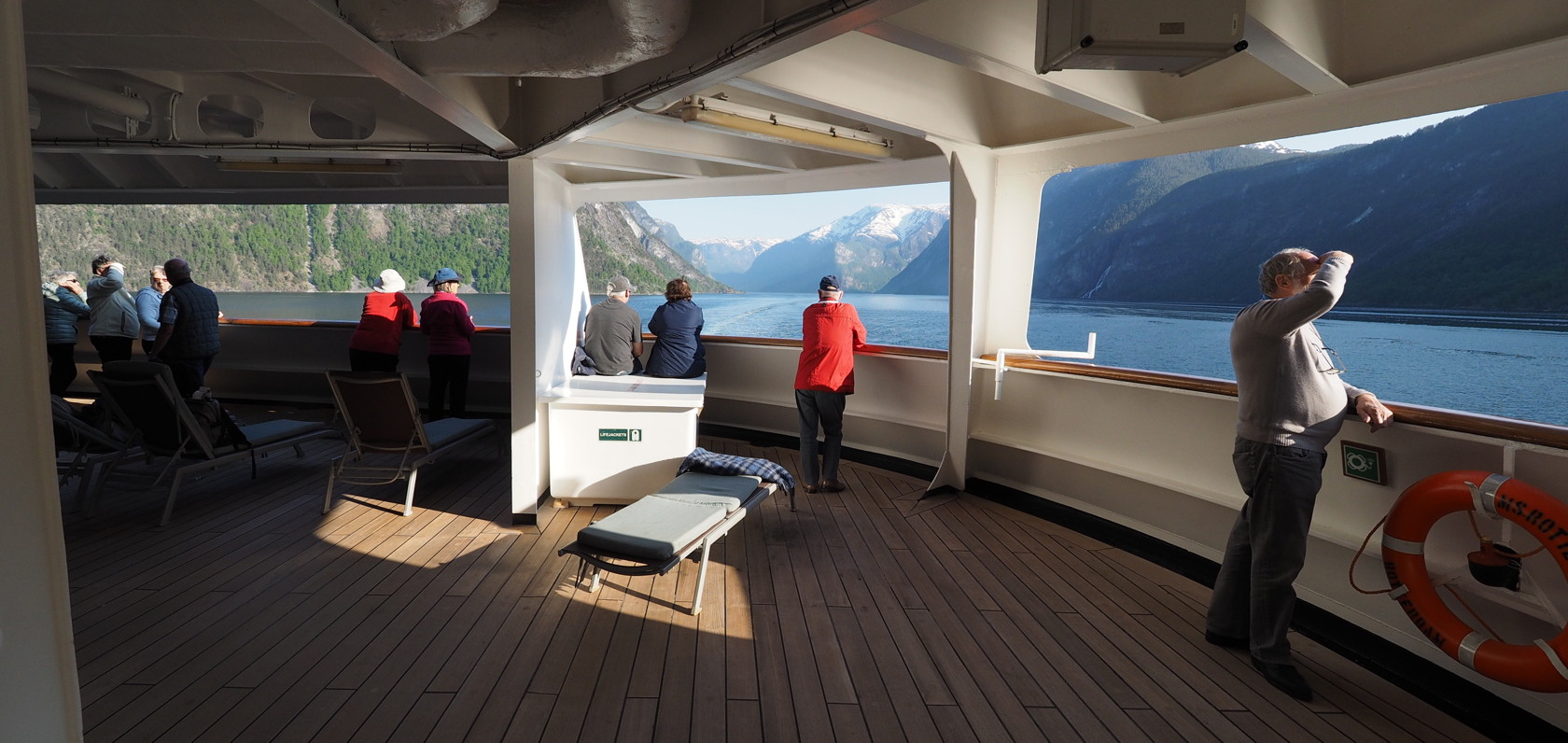 Key is to have unobstructed views in any direction and ease in accessing these viewing locations. The promenade deck of some ships is especially useful – both for exercise in walking and also observing for seabirds, marine mammals, and any other sea creatures.