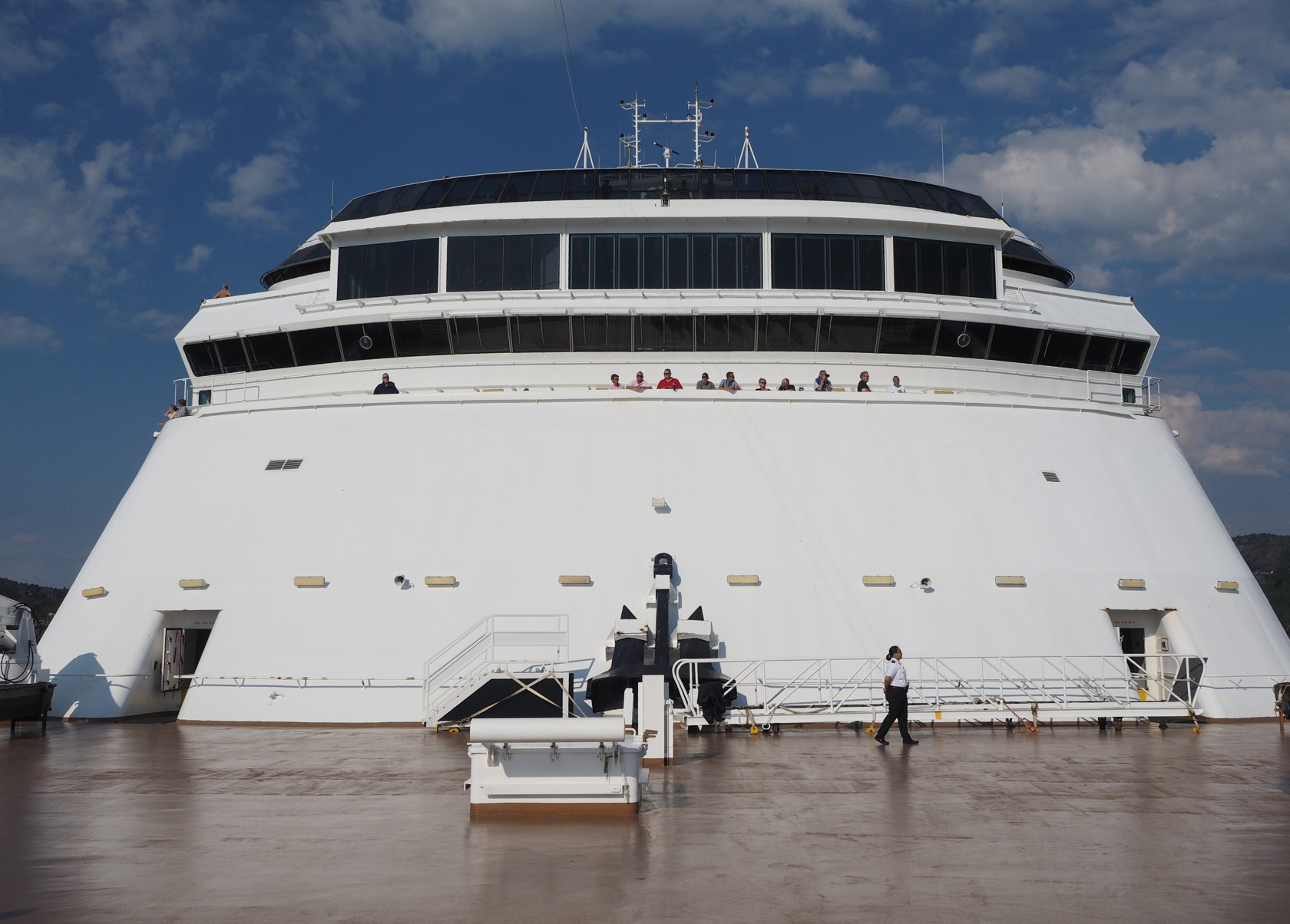 accessibility for many people) and require opening heavy doors, they are not frequently used by most passengers. Of course, you are exposed to the wind and potential rain on this deck. Since the ship might be moving at 10-20 mph into the wind the wind you feel could be quite strong.