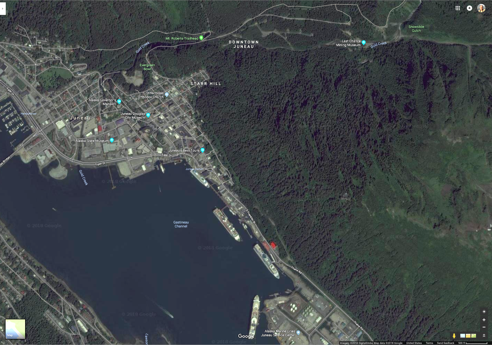 The best way to evaluate whether your port of call is close to a natural landscape is to use Google Earth imagery and try to find where the ship will actually dock (or anchor). The figures below illustrate examples from the Alaskan cruise ports of Juneau and Haines. The image captions explain the point of showing each image.