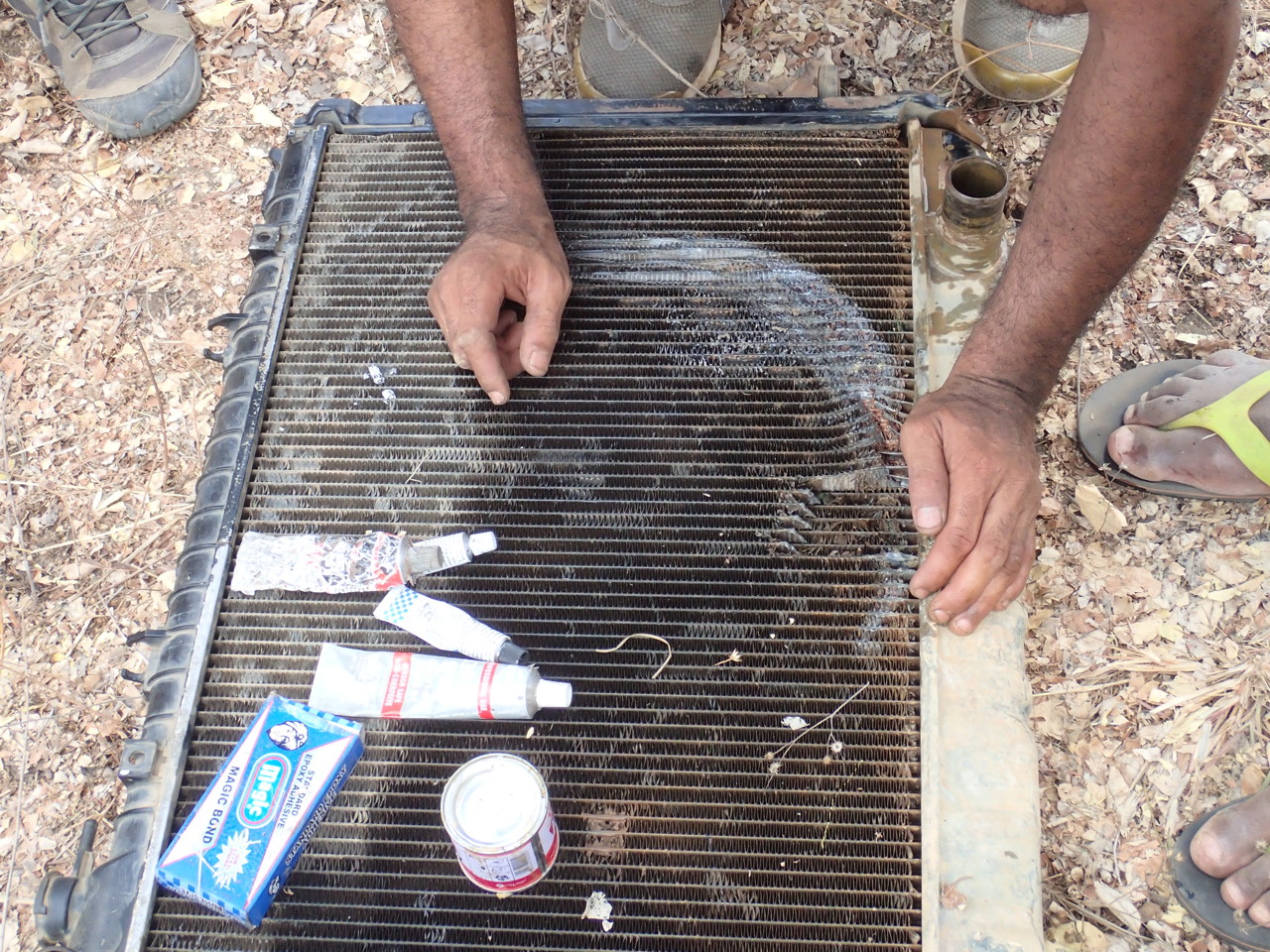 10.27 Our drivers tried everything from gum to glue. They pinched off some of the radiator’s fins that seemed to be leaking.