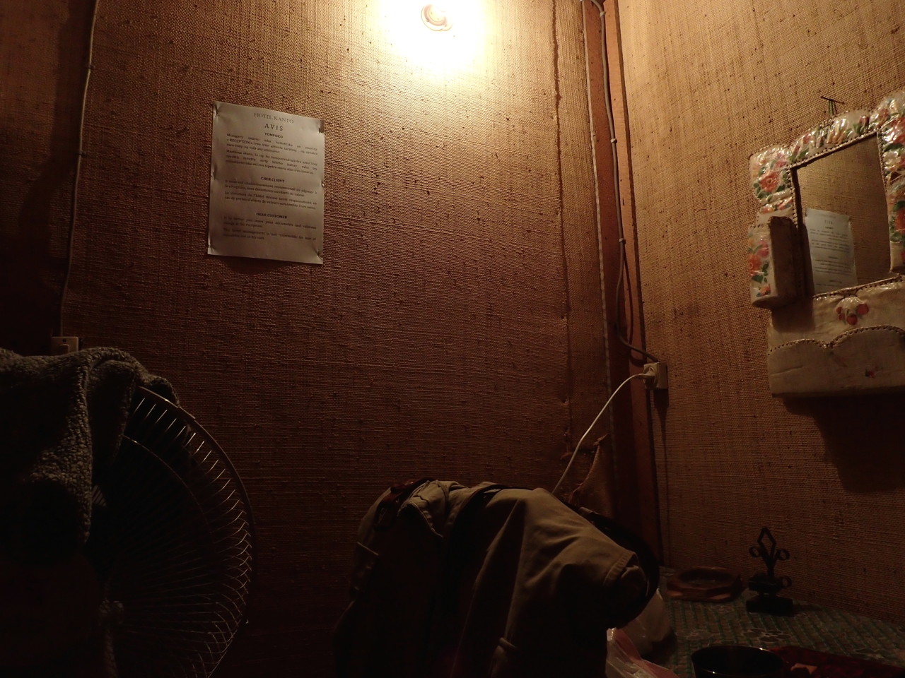 10.31 The proverbial “one bulb” provided atmospheric lighting in our room. It had been a while since we had stayed in rooms with this kind of illumination. It brought back memories of our travels in Mexico in the late 80’s before better hotels were available in the countryside.