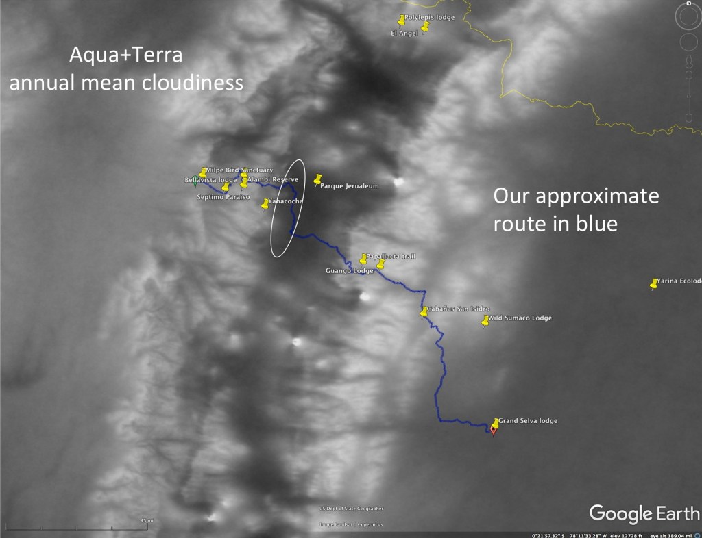 During our 2019 trip we stayed at four lodges including three (Guango, Cabañas San Isidro and Septimo Paraiso) that catering primarily to birders. Most birding lodges are sufficiently remote from nearby towns that the practical solution for food is to purchase the meals at the lodge (these are often part of the overall price). Lodges catering to birders will have hummingbird feeders, fruit trays to attract tanagers and jays and even lights at night to attract moths and beetles for insectivorous birds to feast on the following morning. The need to maintain feeders, walking trails and restaurants with few customers (compared with those in towns), along with the remote nature of the lodges (usually surrounded by forest) means that the daily costs are substantially higher than hotels found in towns. Most birding lodges and their trails can be visited on day trips for a modest fee, so this can be an option for those staying in nearby towns and wising to see the birds. Transportation to and from the nearby town to the lodge will then become the issue. Likewise, nighttime activities (looking for owls, watching the moths coming to lights, frog hunting etc) will be unavailable to day visitors, as well as dawn activities (early morning visits are much harder logistically to non-guests and often restricted in any case to after a certain hour).