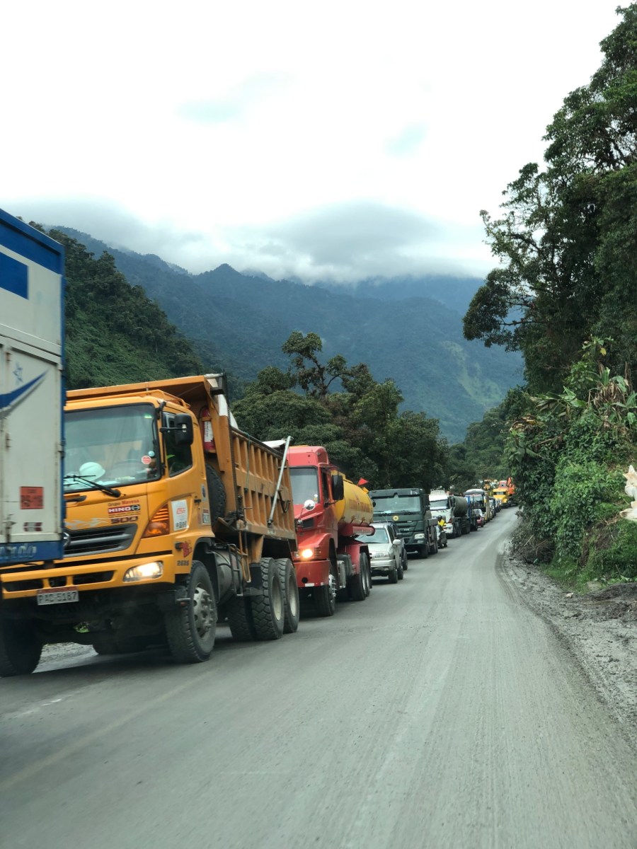Long line of trucks at the landslide waiting for their turn. Note that most traffic to the Amazon is for the oil (or other) industry – not private vehicles.