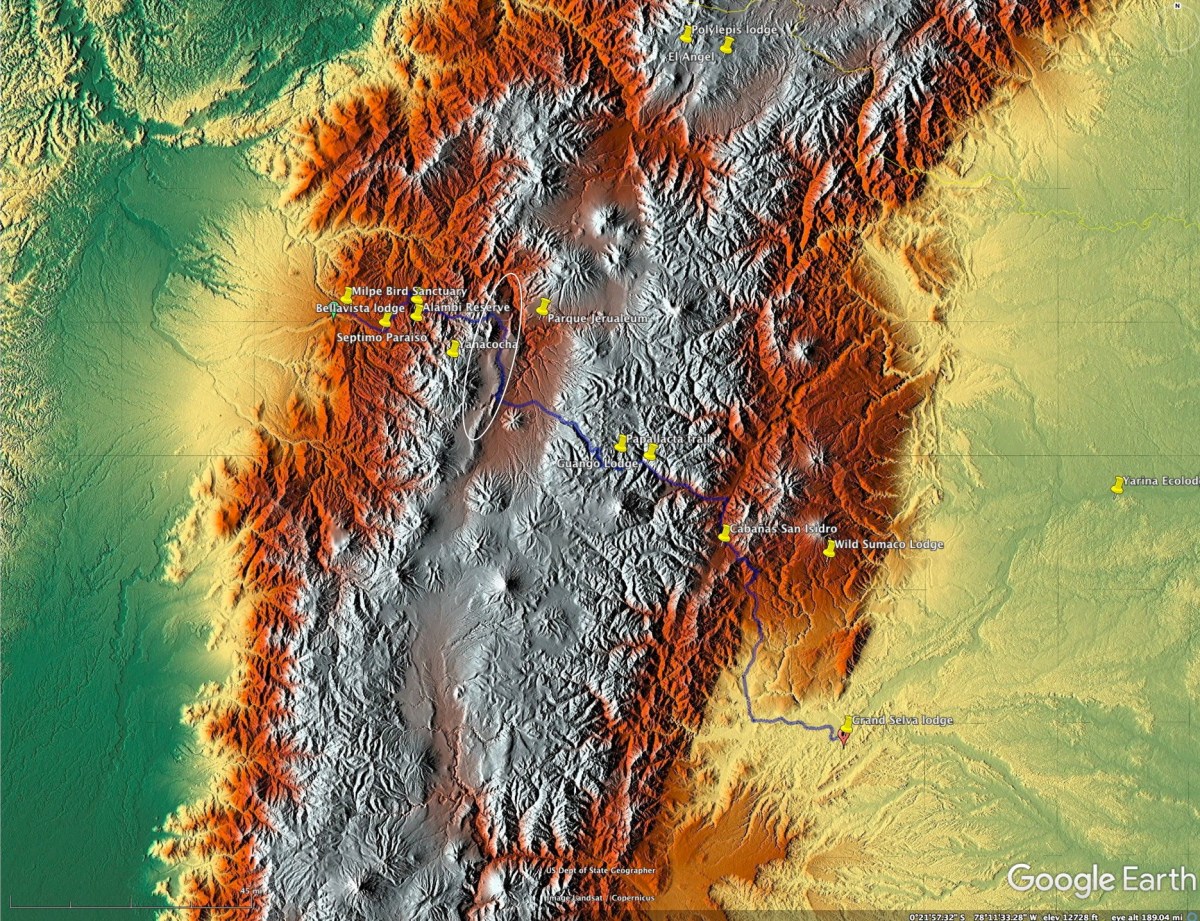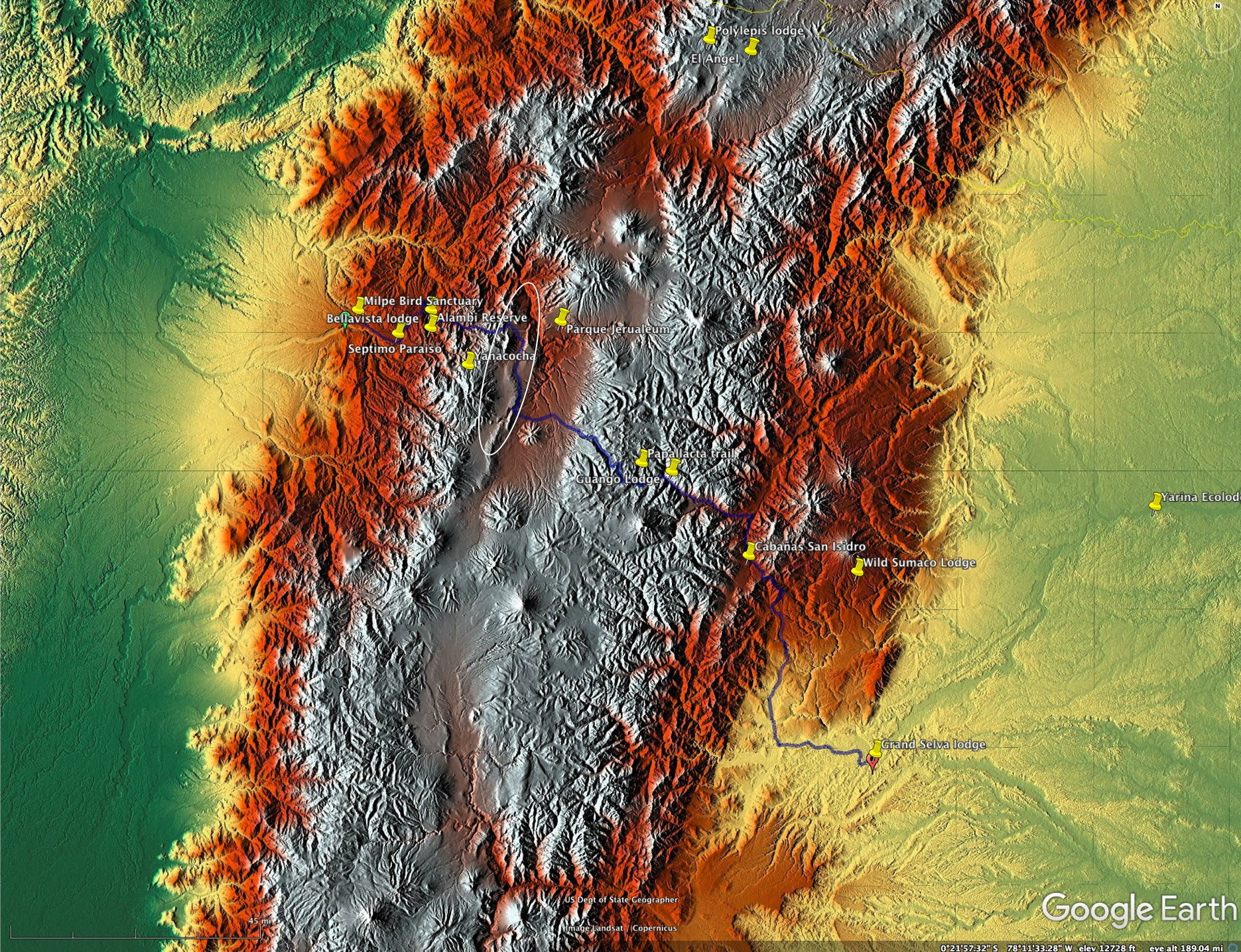 Shaded relief of area shown in previous image. Silver areas are high, green areas are low. Major volcanoes are evident as the conical landforms in various states of erosion.
