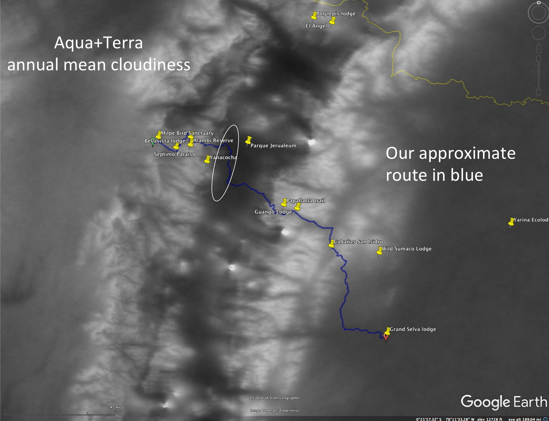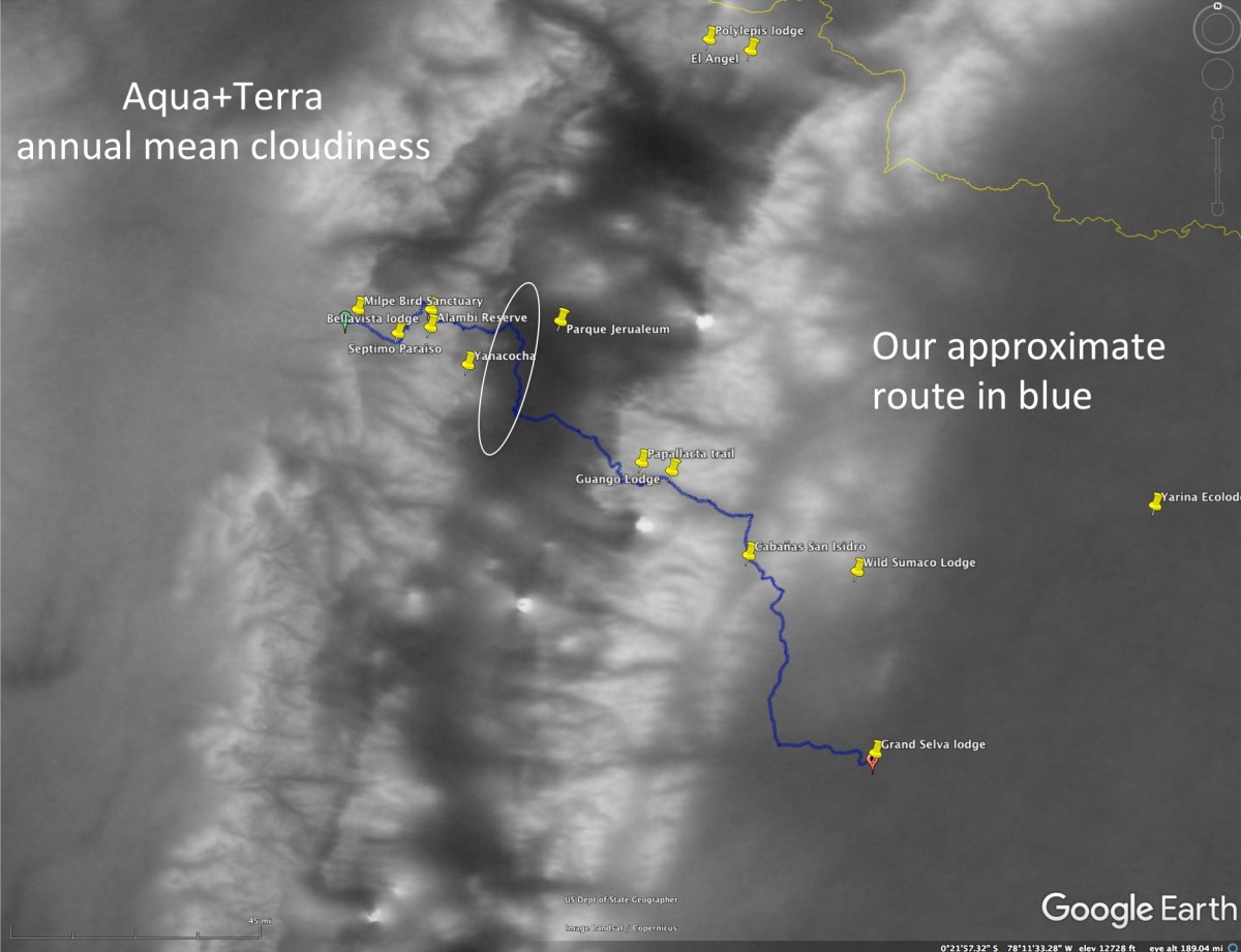 Multi-year average. Brighter areas are more cloudy, darker areas have less cloudiness. Our travel route is in blue and main birding sites are shown. The dry inter-andean valley region lies between the cloudy regions of the eastern and western Andean slopes.