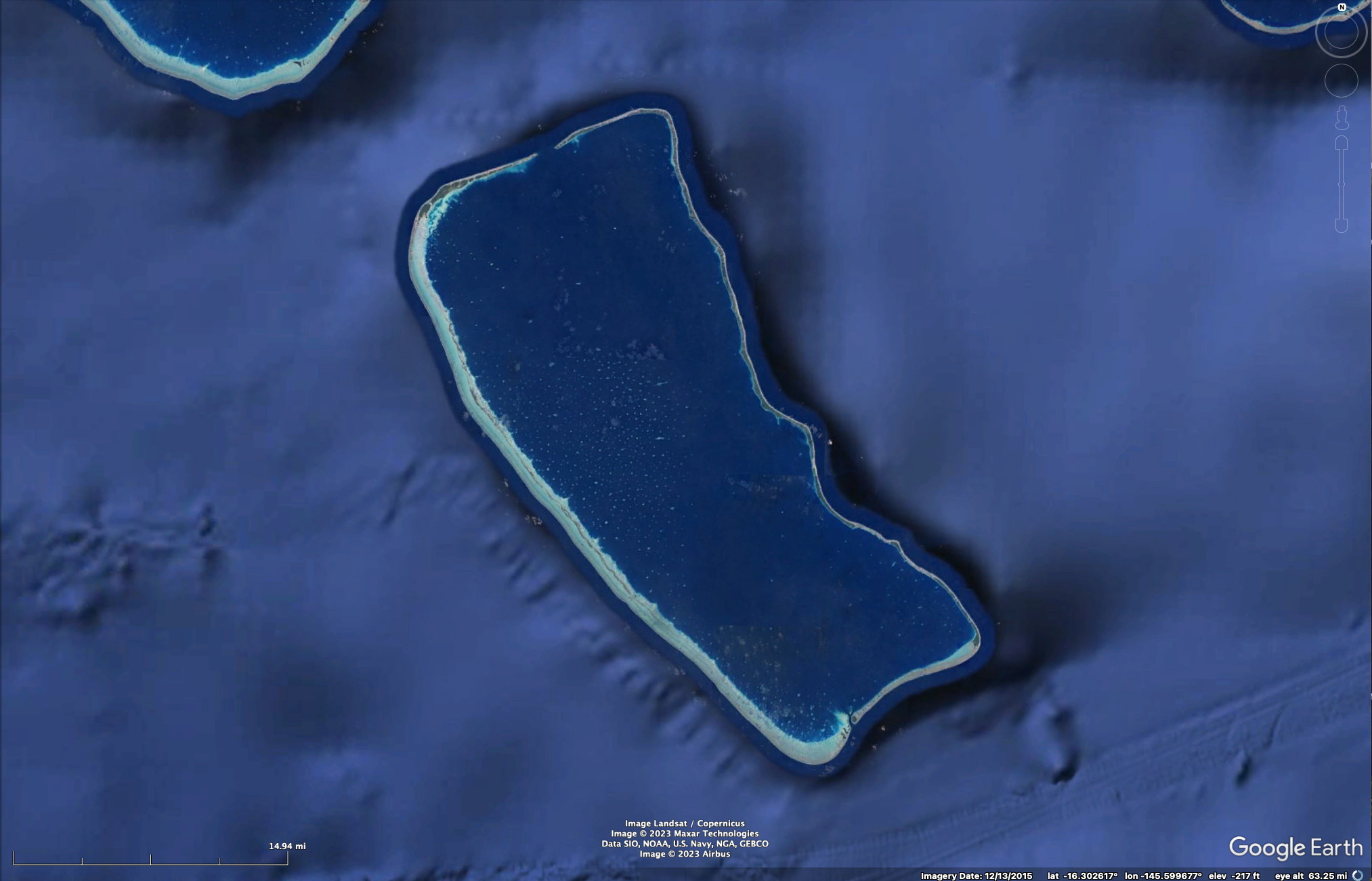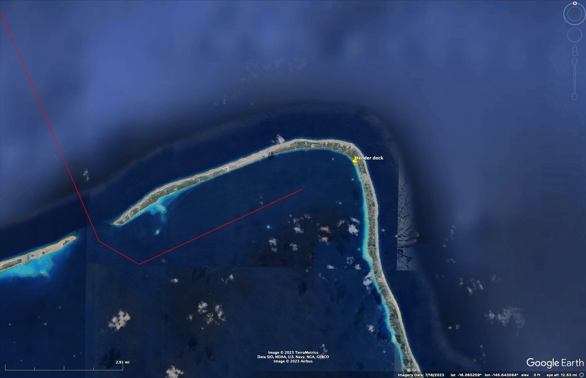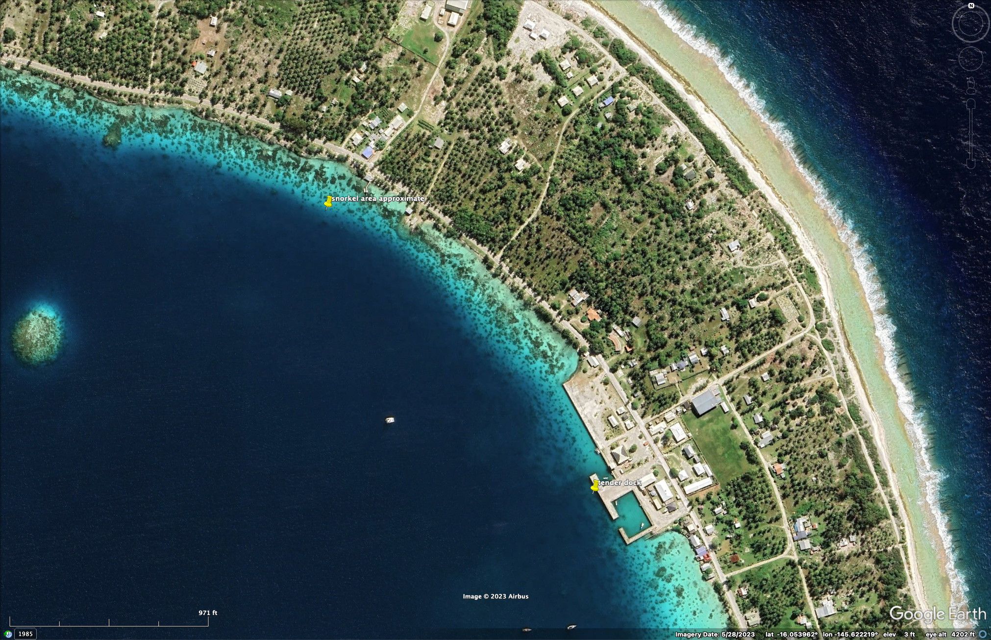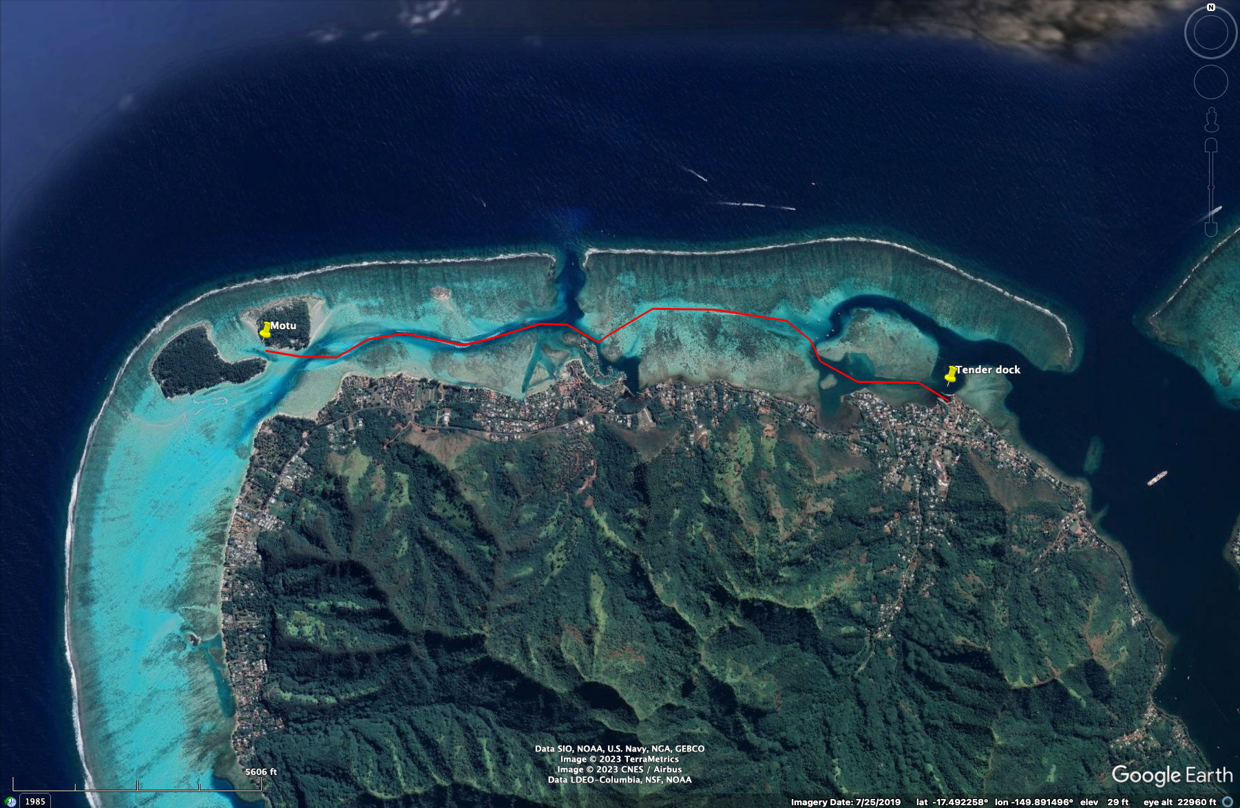 We took a tour (at the tender dock) to a “private” Motu to snorkel. A Motu, in French Polynesia (and perhaps elsewhere in the South Pacific), is a small island that is part of the barrier reef that surrounds an island or is part of an atoll. This was well-known and there are not many motu’s around Moorea. There was a steady stream of tour boats going to our motu (you can even see the boat activity in the second Google image below) and while it was a “private” motu, the motu was divided up into many private pieces of land and you could not walk wherever you wanted to. Also, our snorkeling area was roped off (though you could go under it to go outside). But going outside was a bit risky, since slow moving boats were coming to and from the motu. In any case, we saw quite a bit from the small area that we snorkeled in.