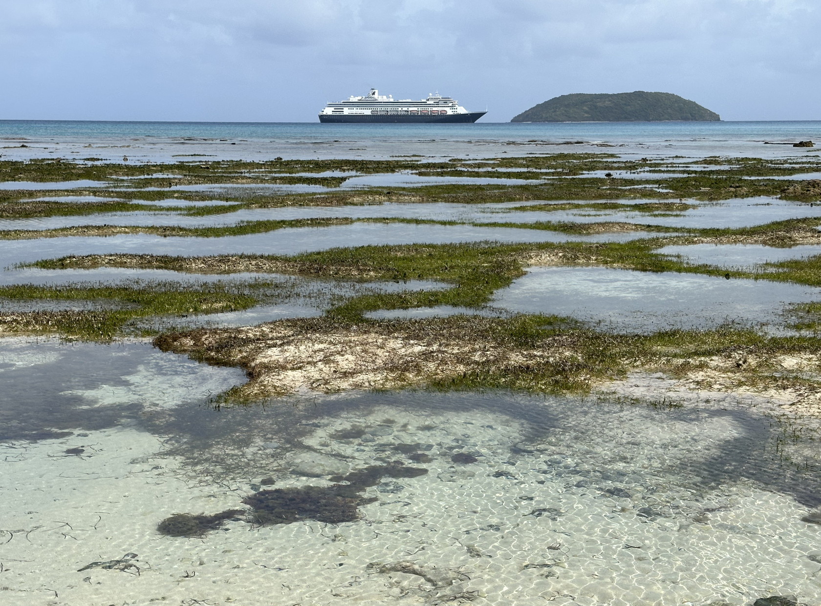 This was a tender to a small, floating dock on the sandy beach. We walked south towards a rockier area where it was apparent that there might be something other than a sandy bottom. I had seen this from Google Earth imagery so there was little uncertainty. The only problem was that the tide was low, and that it was difficult to get into the water when we went ashore. For this reason, our first visit to the beach was fully dressed and we went up a short hill partway to see what natural vegetation was there. We also photographed various items along the beach.