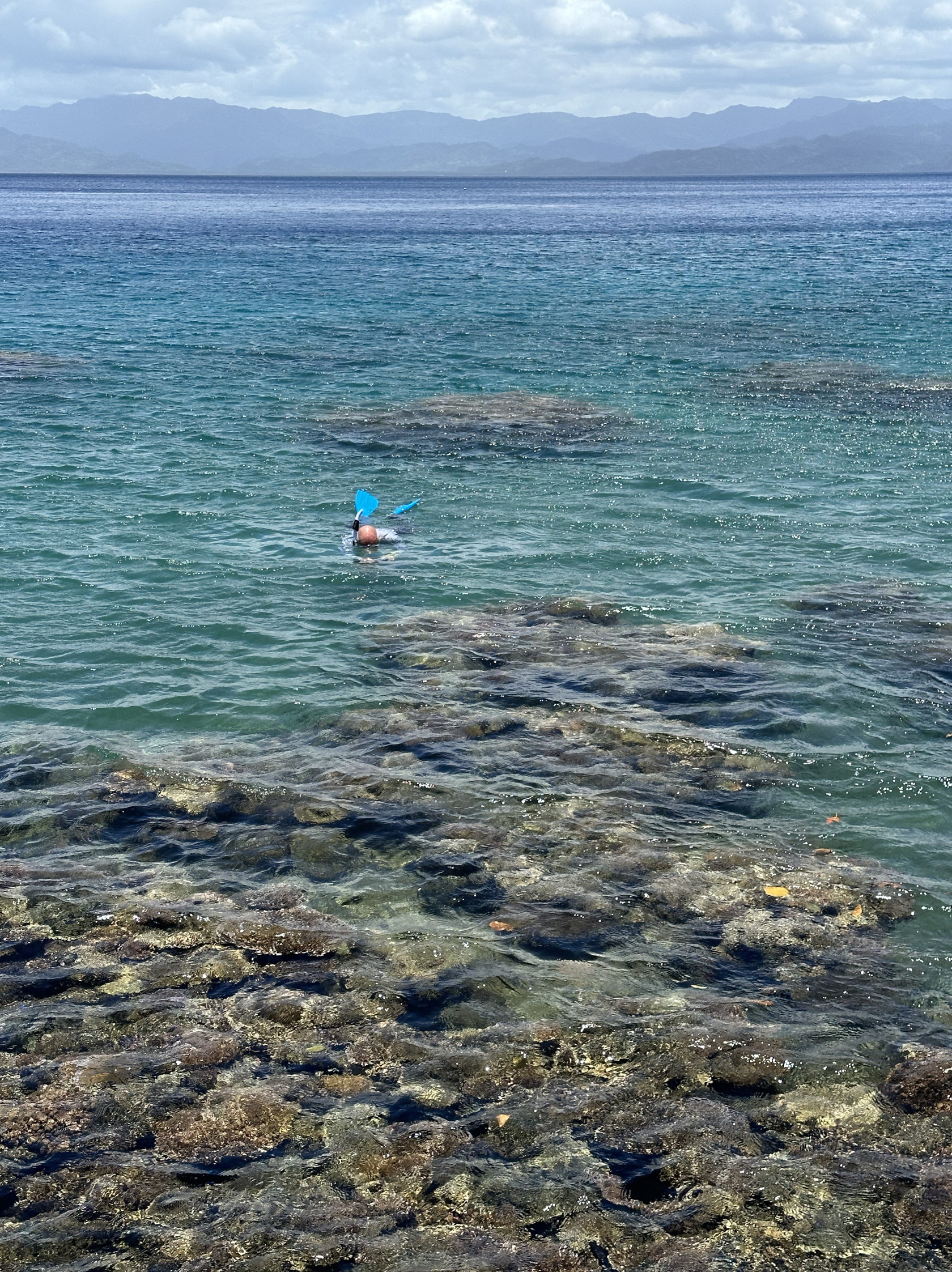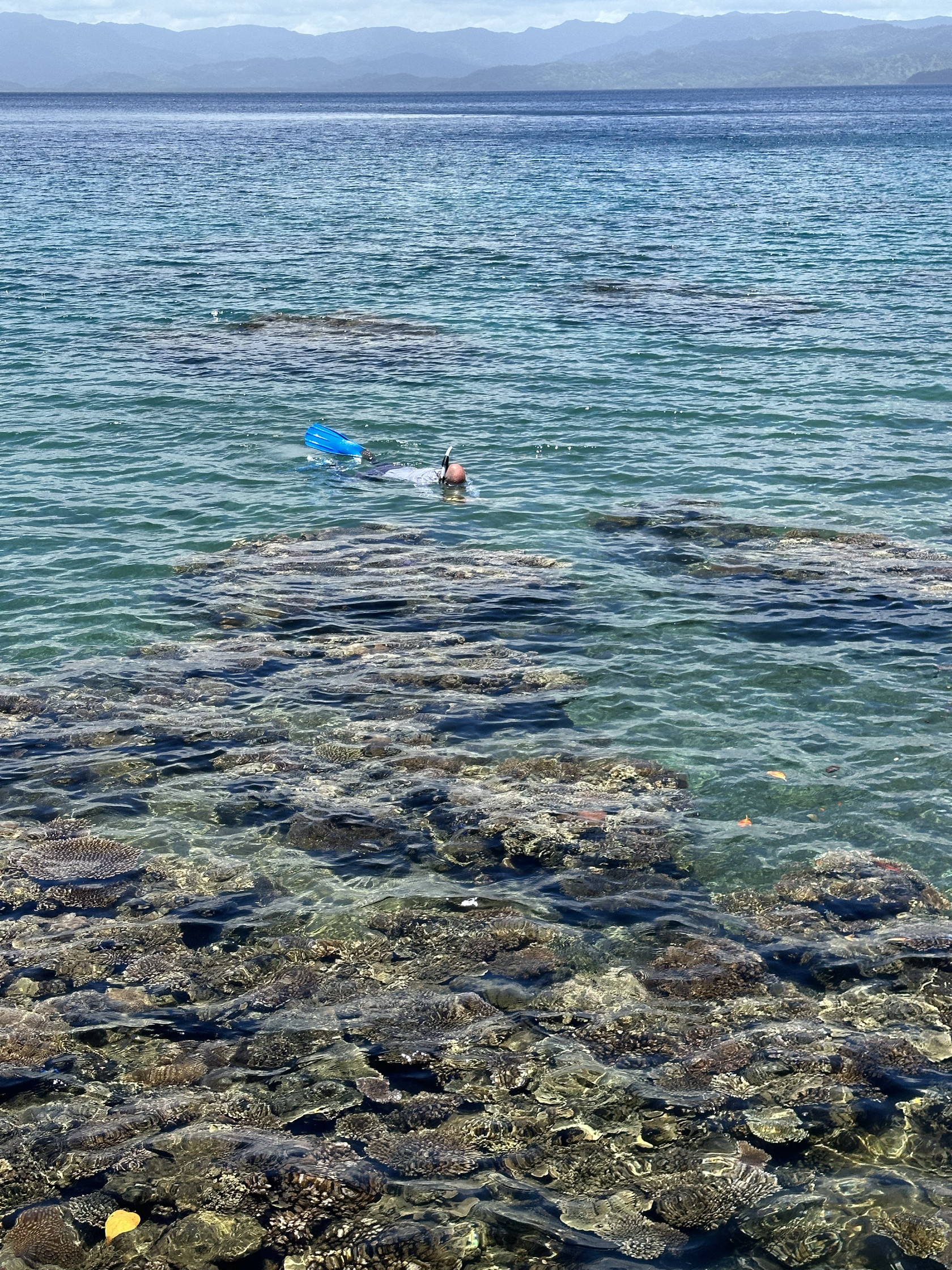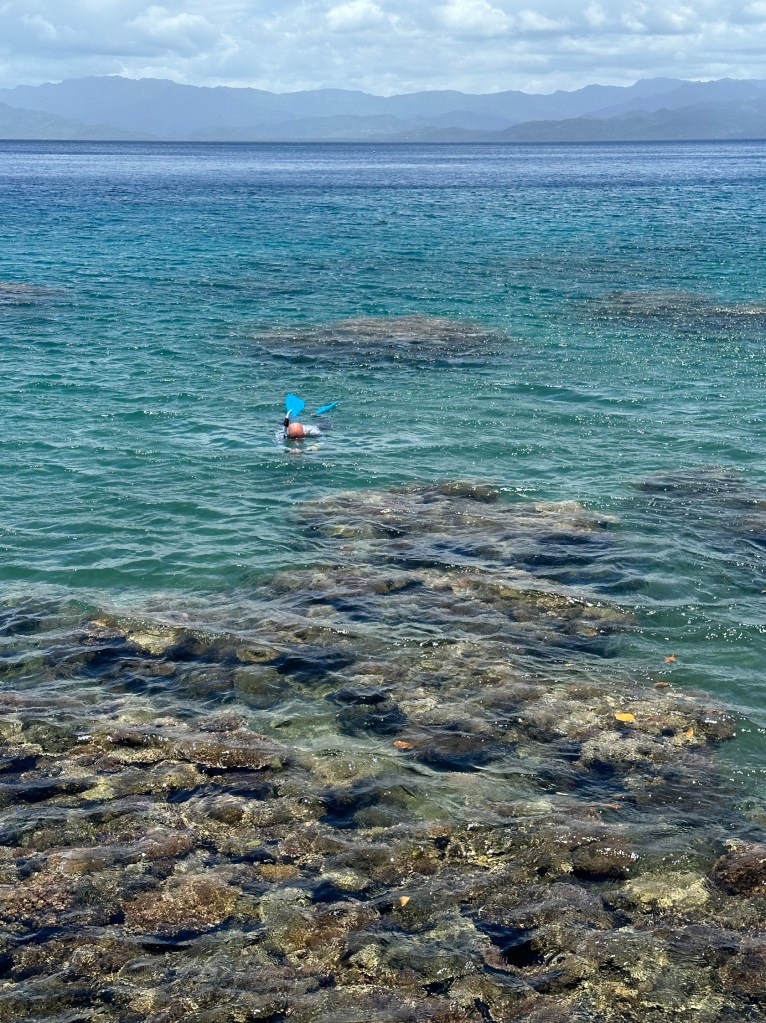 We tendered ashore and walked a ways from the tender dock towards the north, eventually finding several places to access the interior lagoon. Getting into the water wasn’t easy with fins on, and I didn’t have water shoes, so I used my sneakers. But then, in the water, you have to transition from the sneakers to the fins… not so easy. I threw the sneakers ashore. Repeat for the process getting out – with Rosario’s help.
