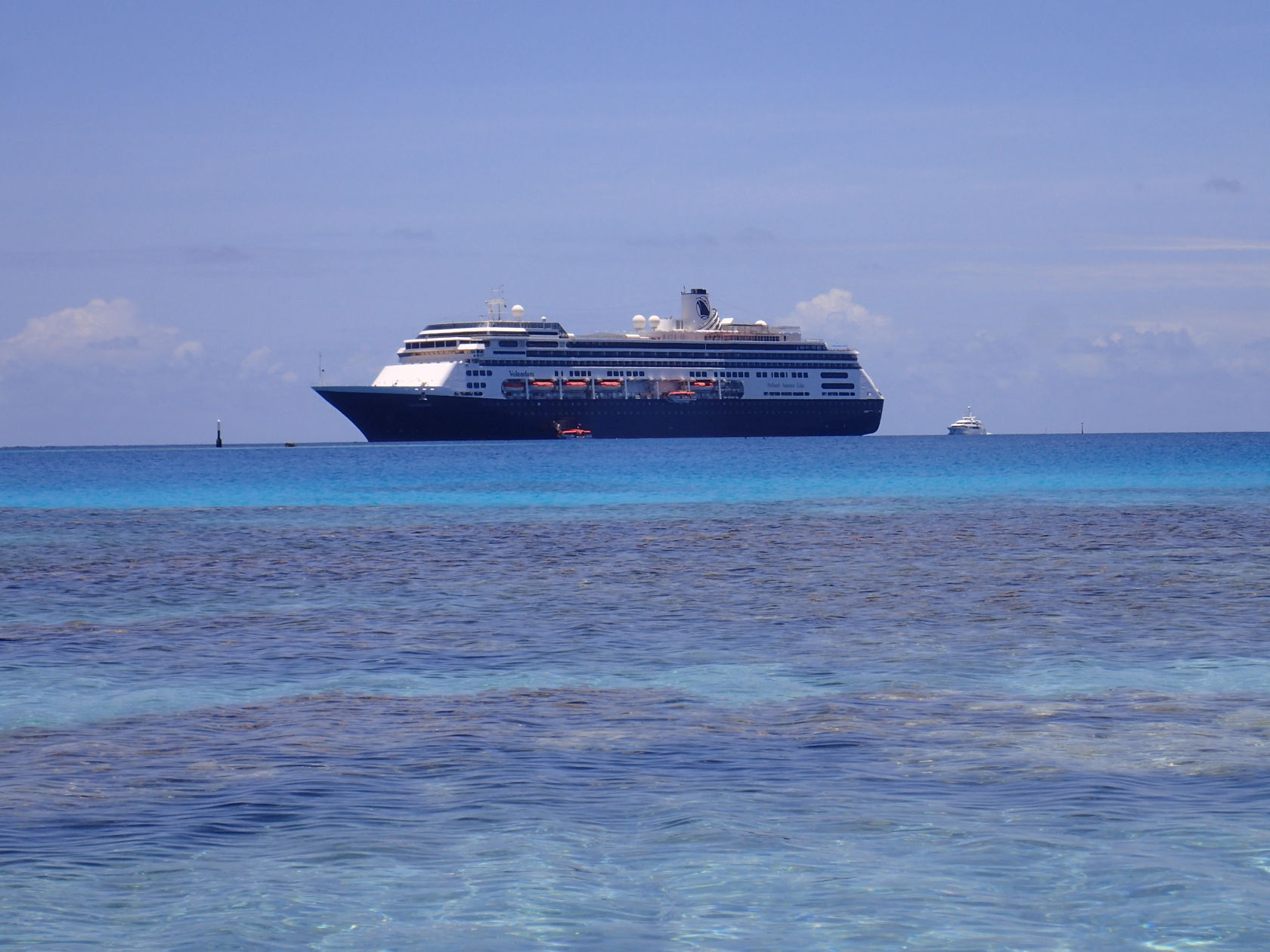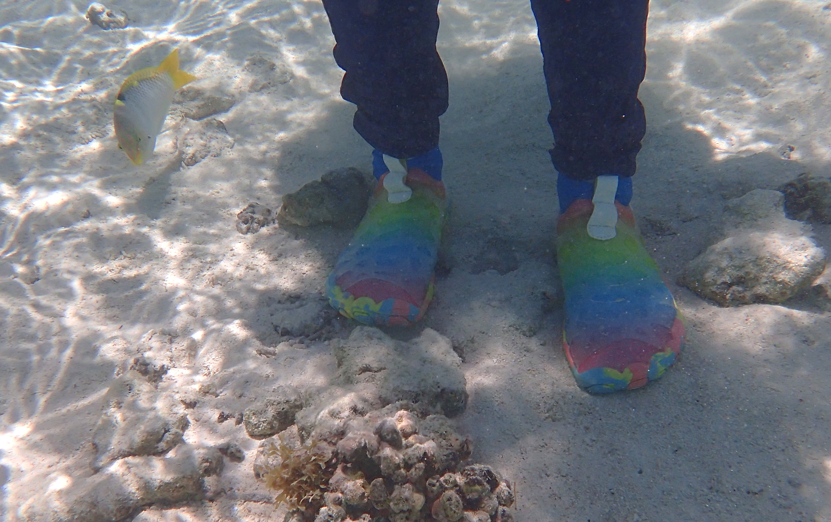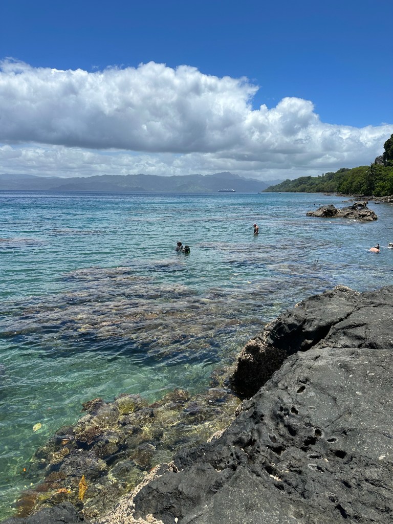 We tendered ashore and walked a ways from the tender dock towards the north, eventually finding several places to access the interior lagoon. Getting into the water wasn’t easy with fins on, and I didn’t have water shoes, so I used my sneakers. But then, in the water, you have to transition from the sneakers to the fins… not so easy. I threw the sneakers ashore. Repeat for the process getting out – with Rosario’s help.